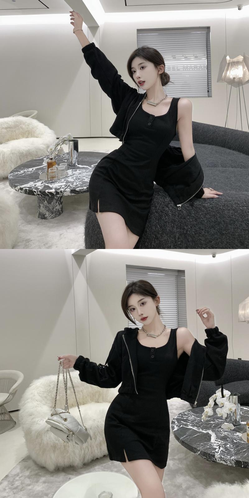 色:グレーコート,グレーのタンクトップ,黒いジャケット,黒のタンクスカート