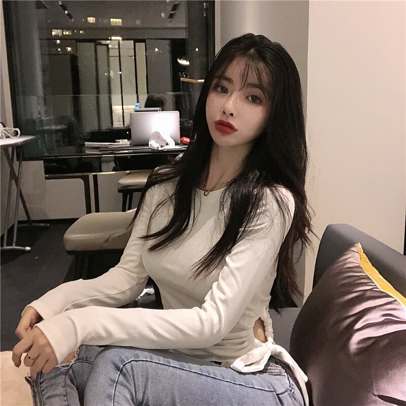 サイドギャザーショートトップス 長袖スリーブTシャツ シャツ オータム ロング レース 秋物 レースアップ Xiaofeijia67487595909