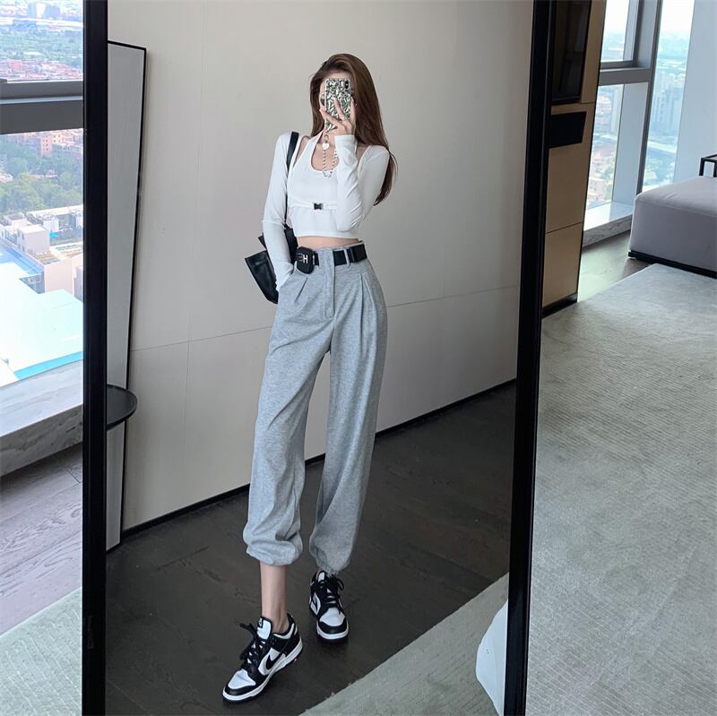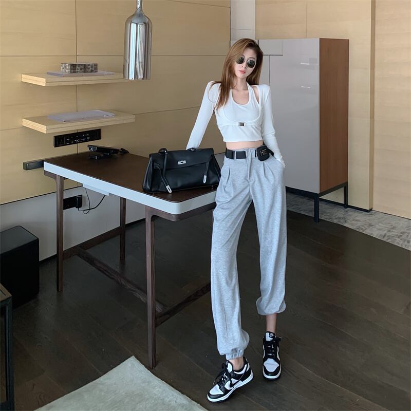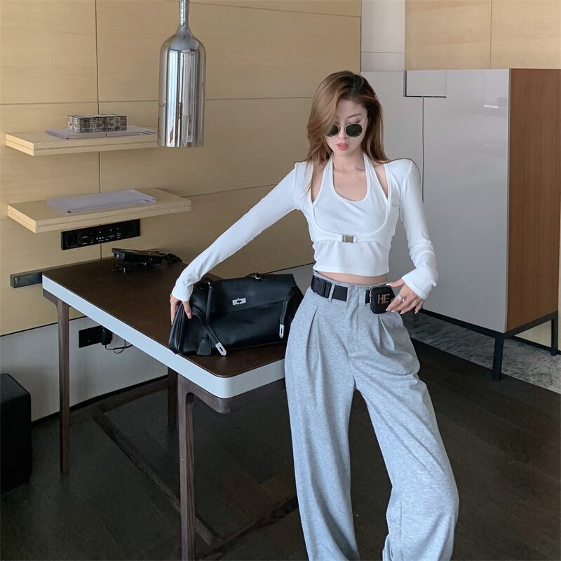 グレーショートオータムカジュアルウェストルーズ ハイウェスト 秋物 ハーネス ベルト Xiaofeijia15128750472