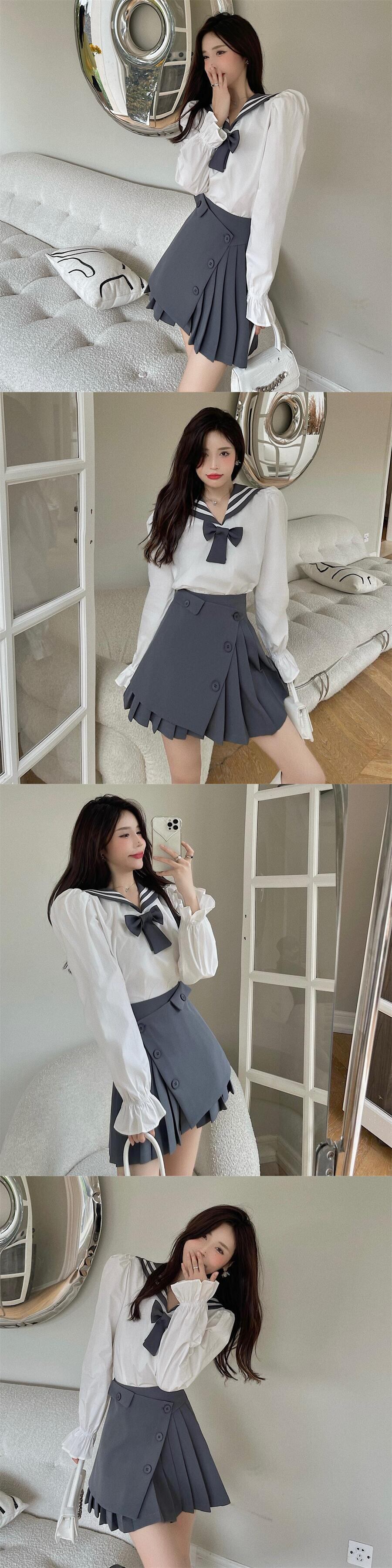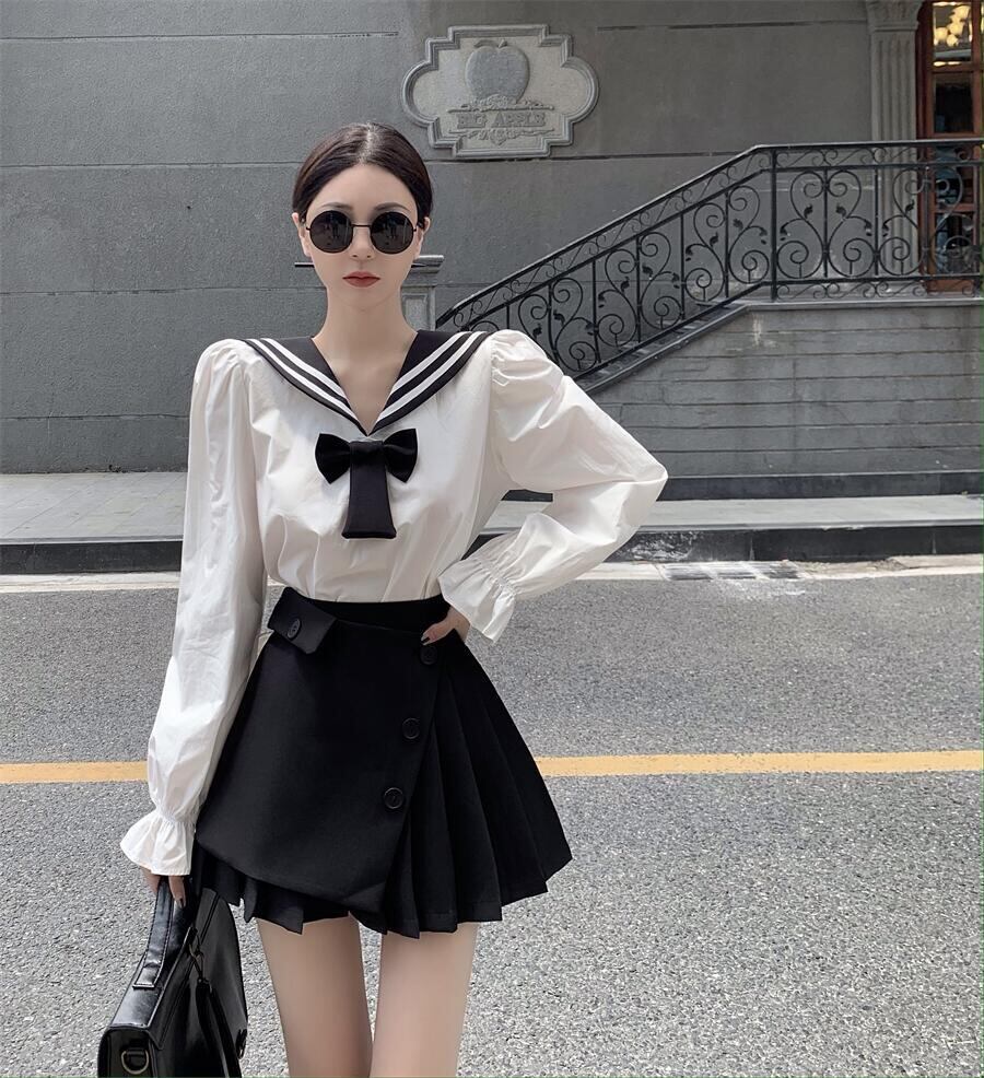 スタイルプリーツスカート オータムスリーブショートネイビーリボンシャツ 秋物 Xiaofeijia63874555535