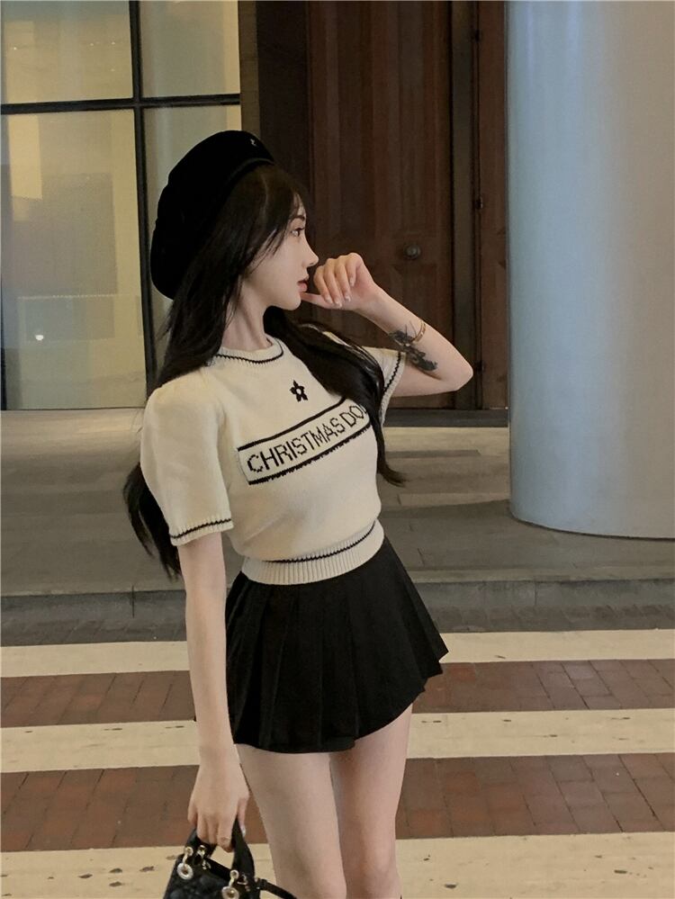 オータムセーター ショートラウンドネックニットスリムトップス レッド 刺繍 秋物 Oネック Xiaofeijia73095891666