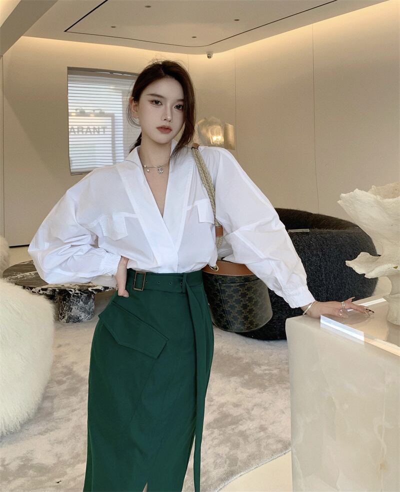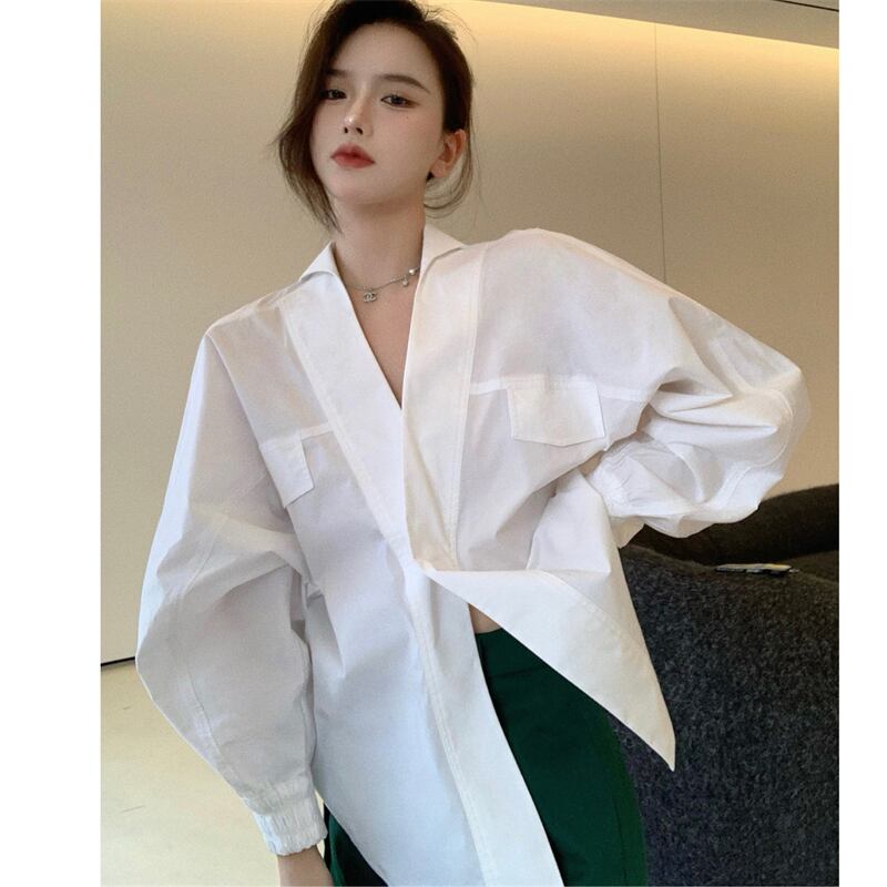ホワイトシャツ オータムVネックトップス スタイルルーズ ロング 秋物 Xiaofeijia56346183870