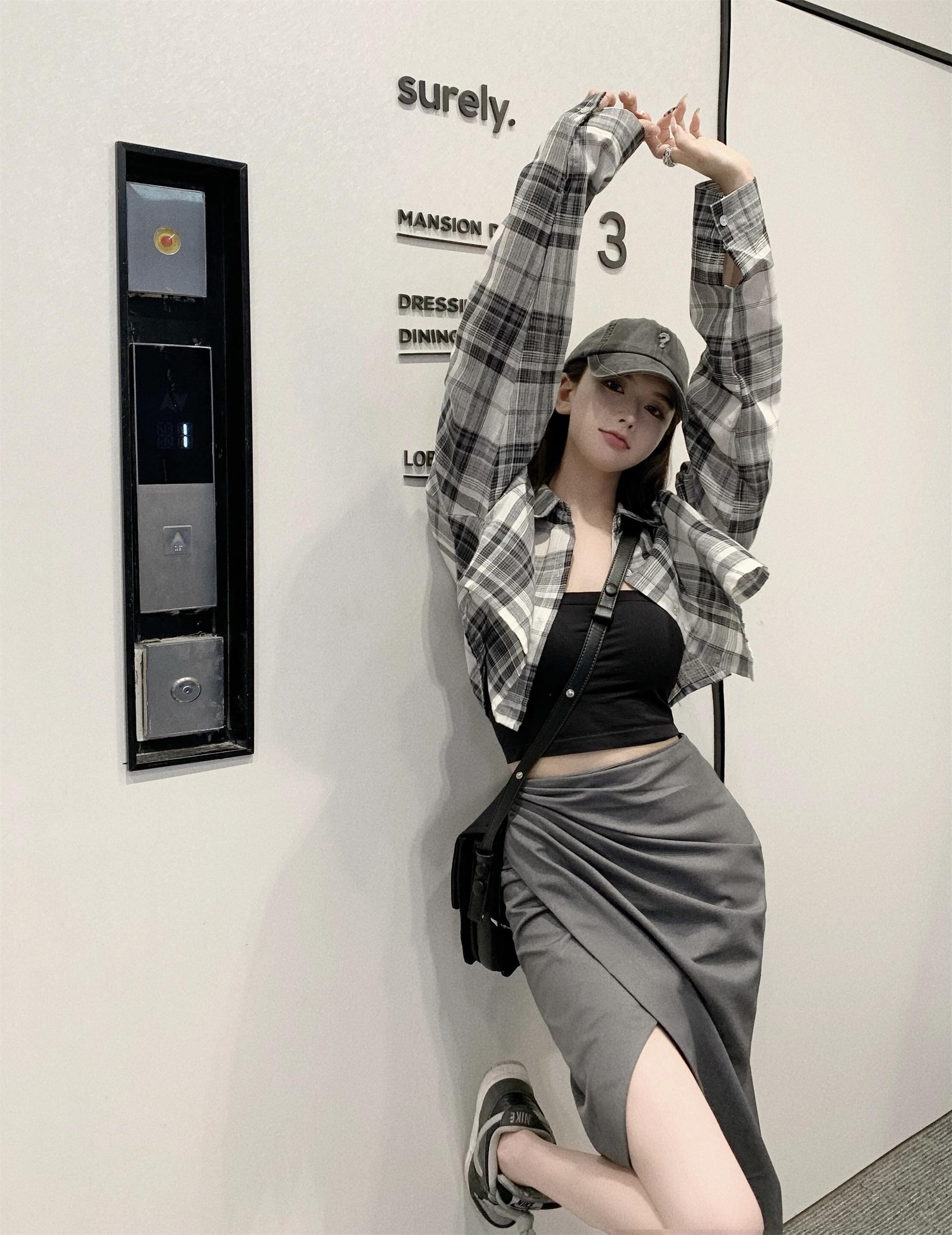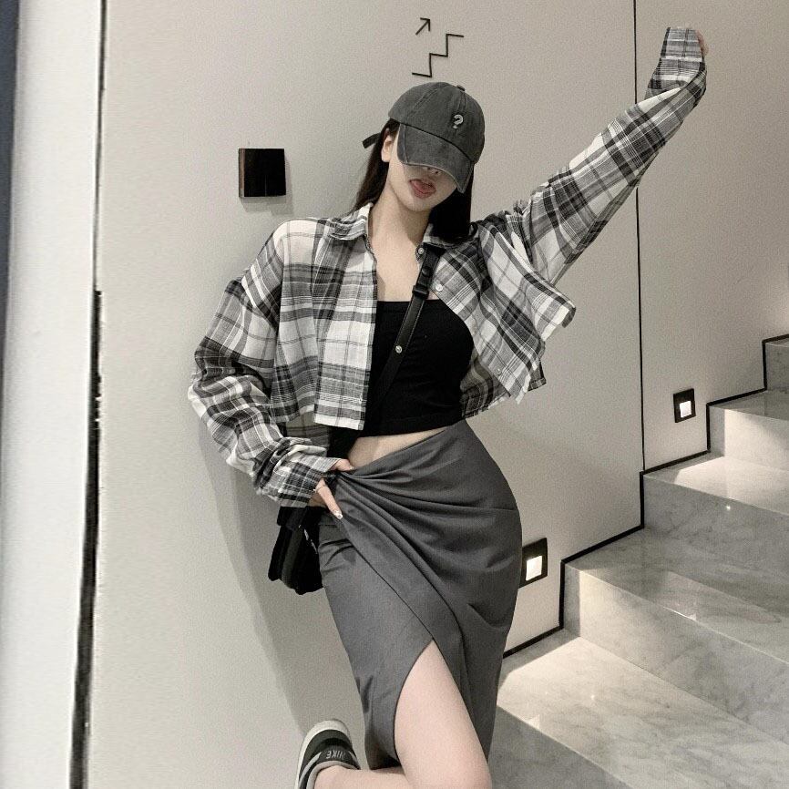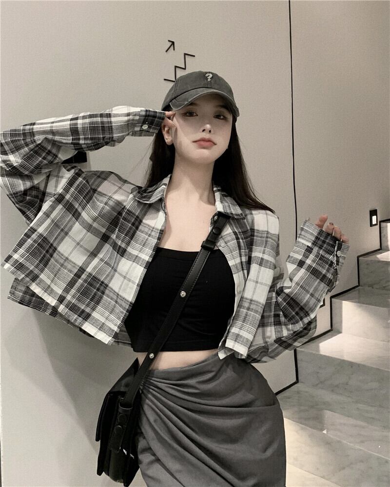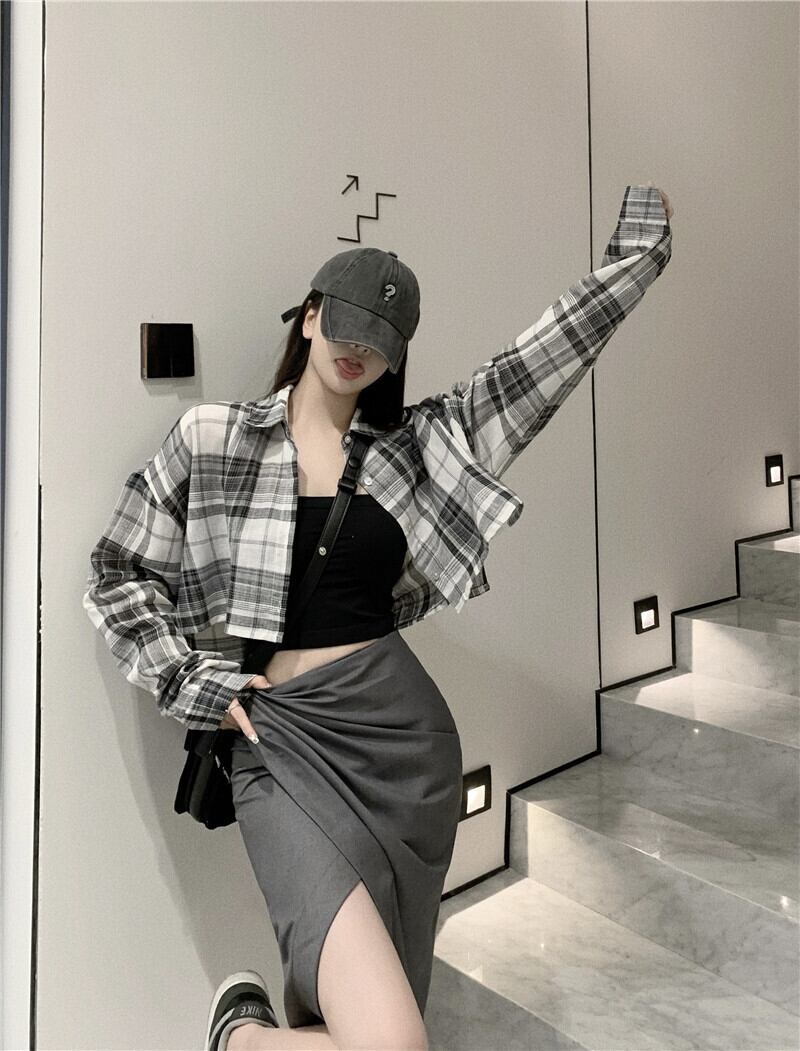 ショートトップス ルーズオータム格子柄ジャケット スタンダードスタイルシャツ ロング レトロ 秋物 Xiaofeijia90889614918