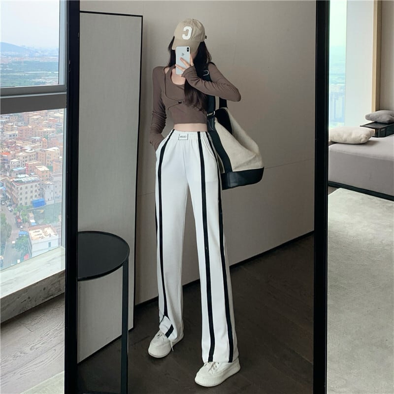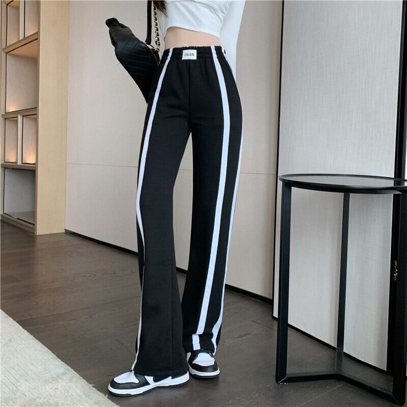 ストレッチハイウェストウェストサイドストライプワイドレッグカジュアルパンツ オータムスタイルルーズ エラスティック 伸縮 大きめサイズ 秋物 ワイドパンツ Xiaofeijia85619483618