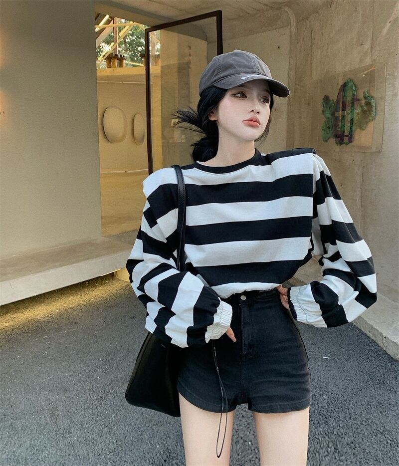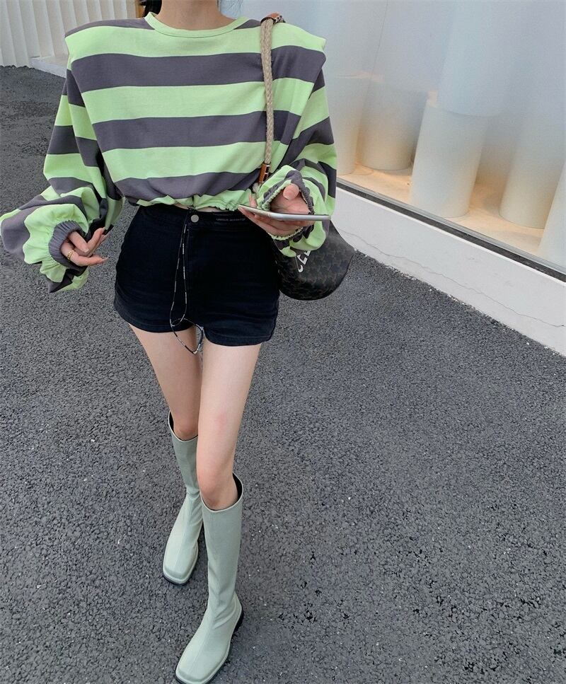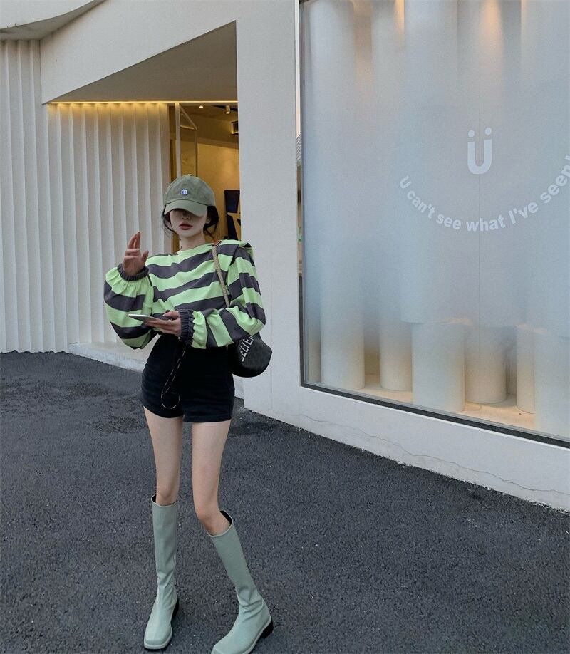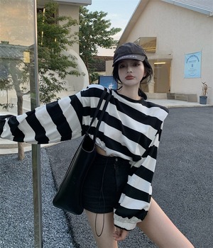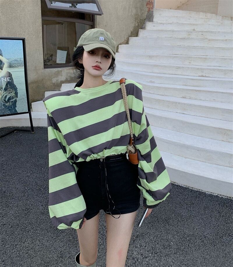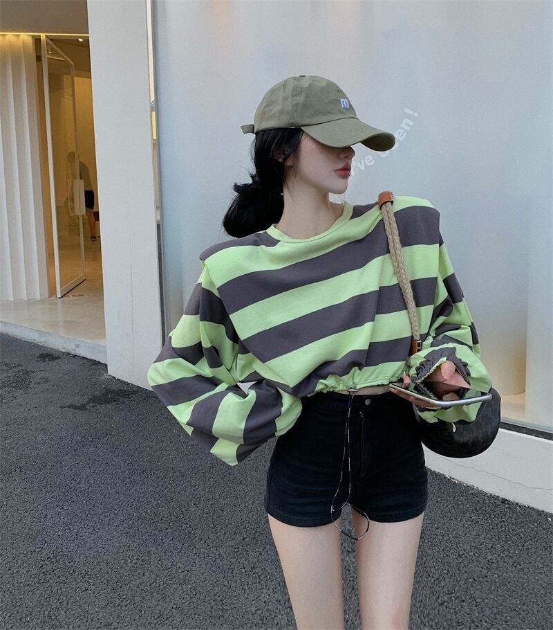 オータムスタイルスタンダードストライプセーター ルーズウェストショートトップス ロング レトロ 秋物 Xiaofeijia92793308002