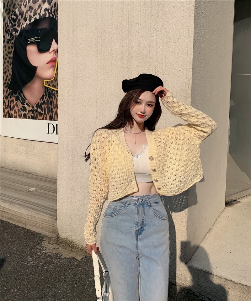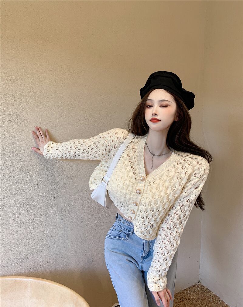 オータムショートトップス ルーズスタイルコート パールバックルニットカーディガンレディース ロング 秋物 真珠 Xiaofeijia69184663438