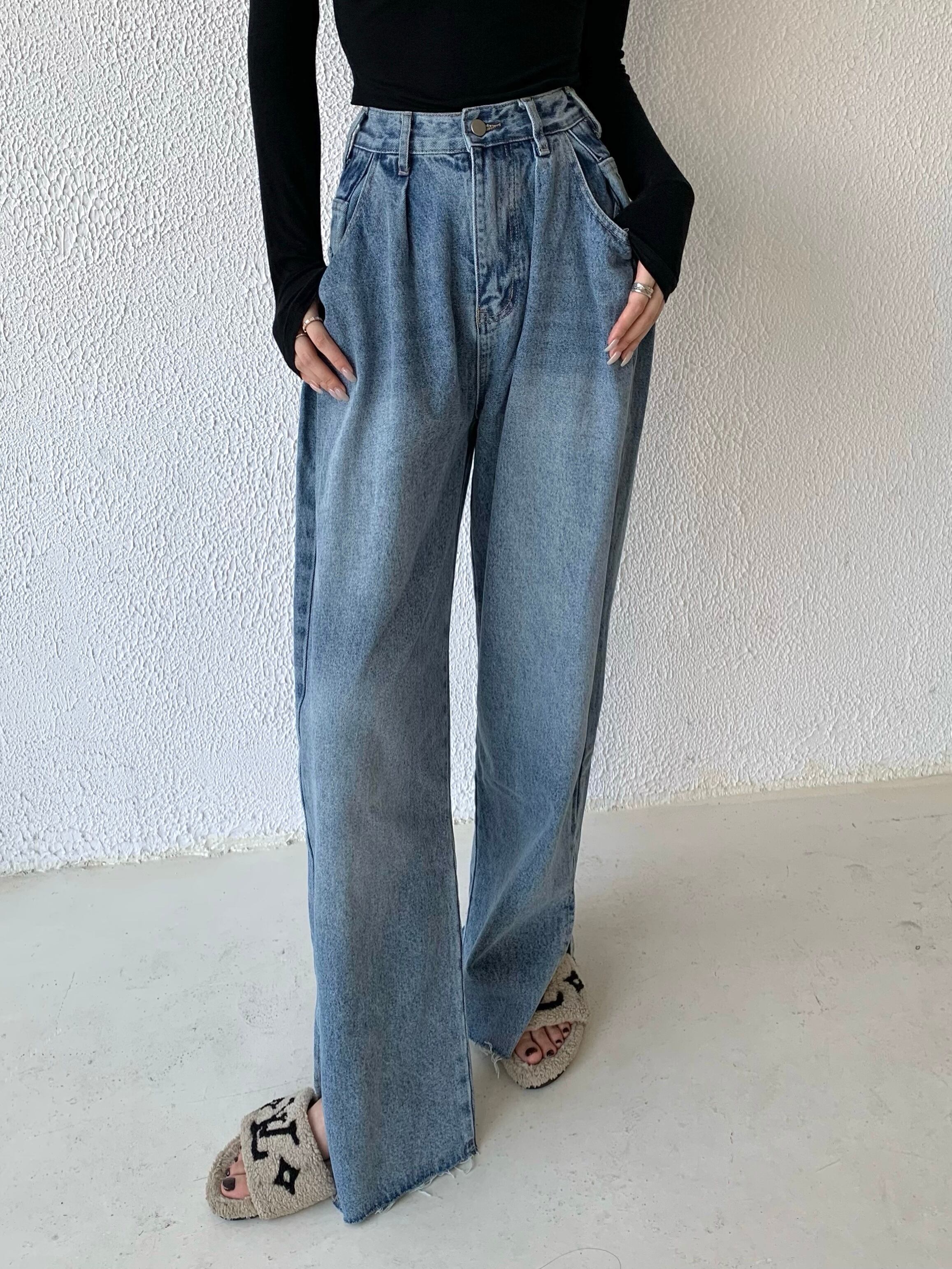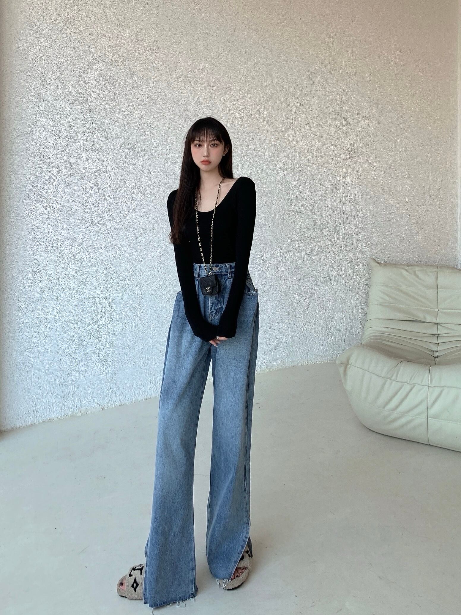 ウェストサイドスリットジーンズ スプリングオータムルーズスタンダードブルーパンツ レトロ 春物 秋物 Xiaofeijia29702155057