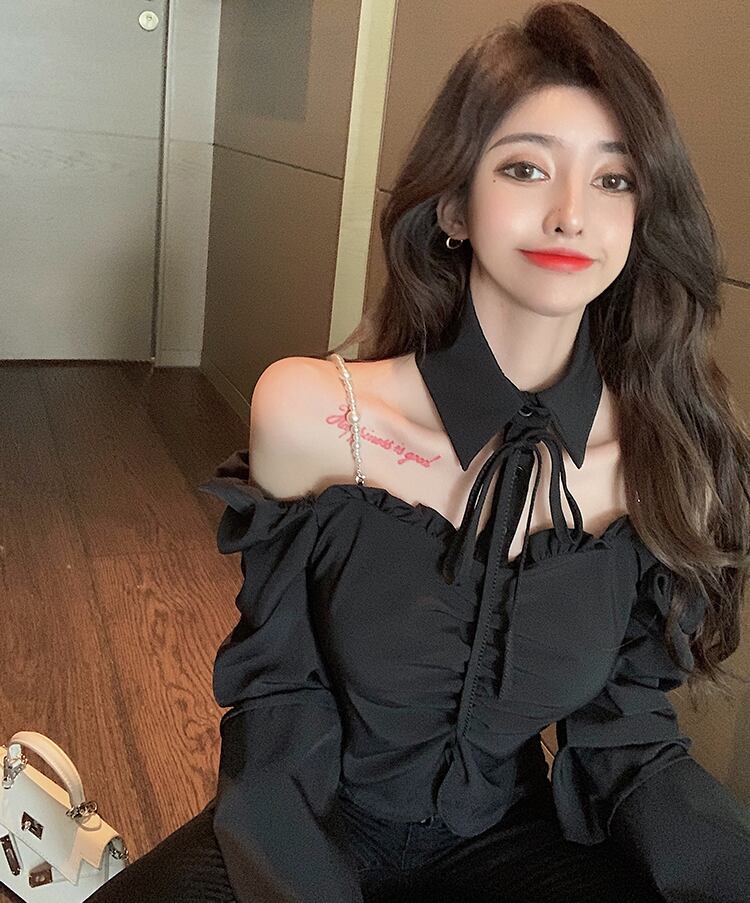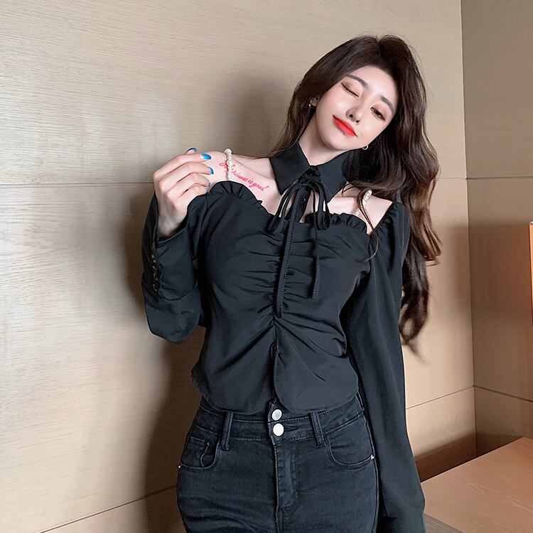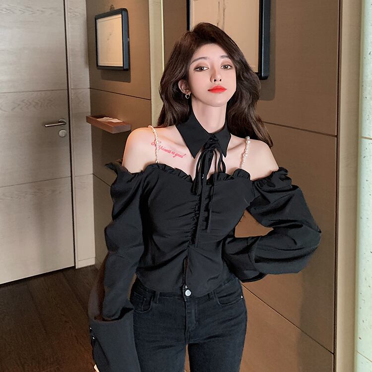 ホルターパールトップス オータムストラップレス長袖スリーブショートシャツ ロング 秋物 真珠 Xiaofeijia35113112773