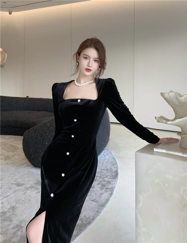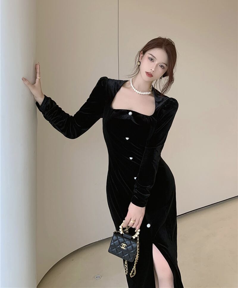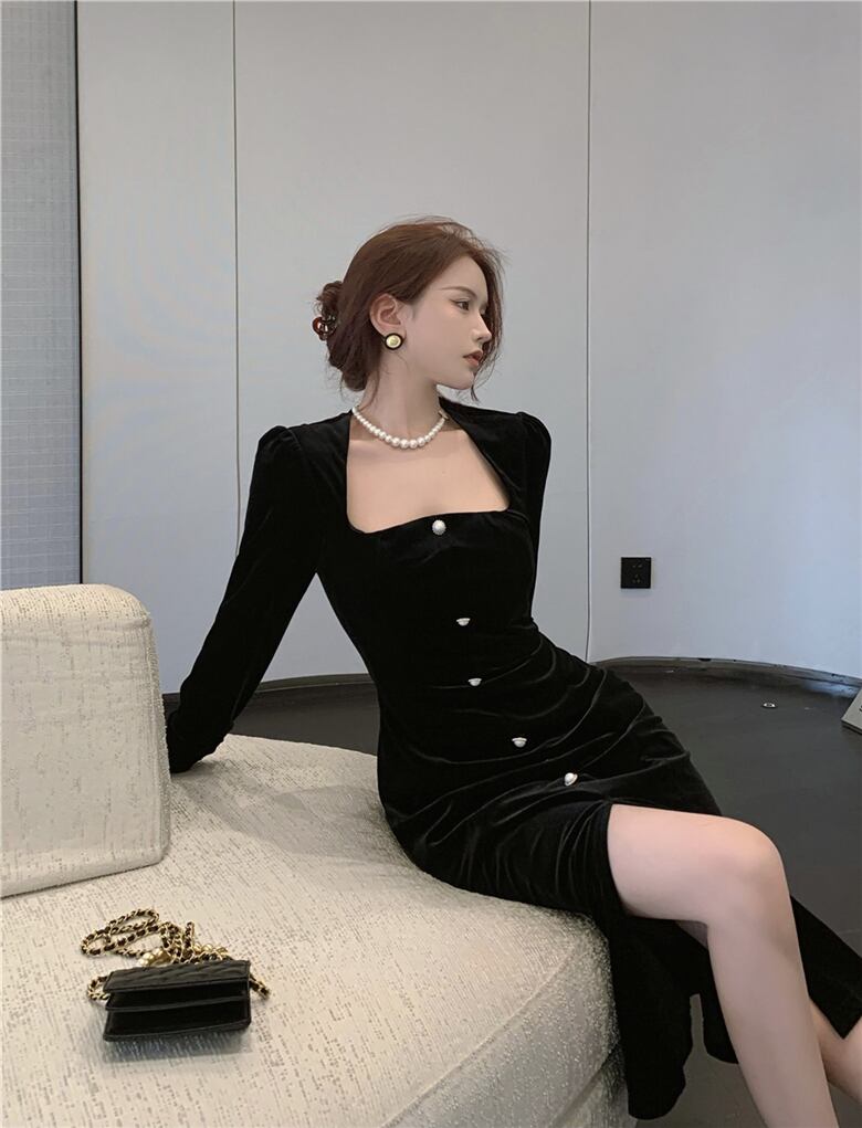 ブラックドレス オータムスタイルゴールドベルベットカラースカート ロング 秋物 スクウェア Xiaofeijia39422816943