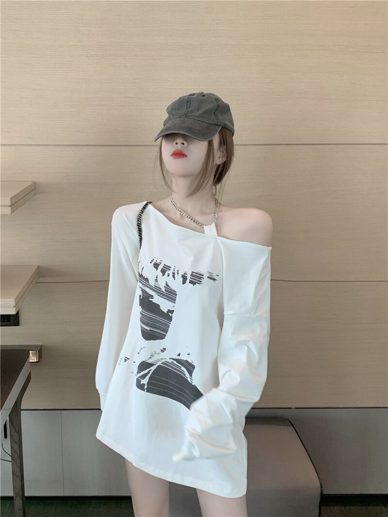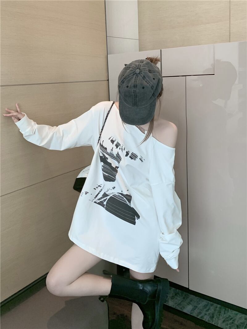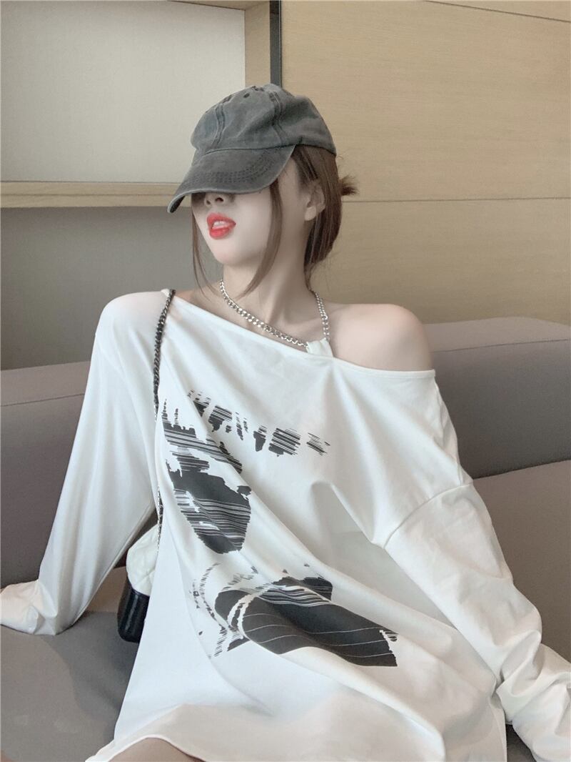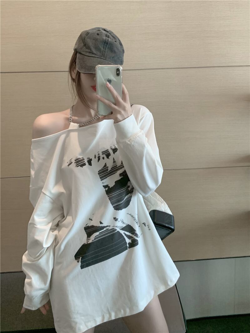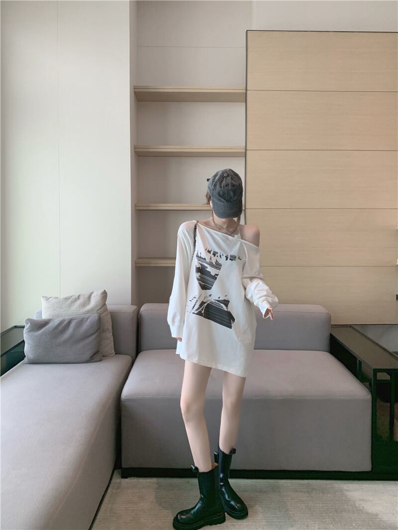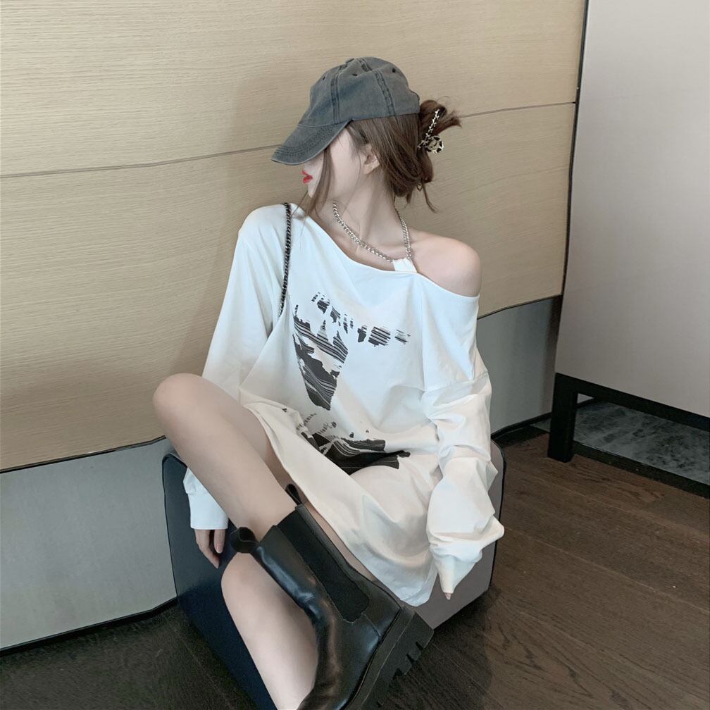 シルバーチェーン ホワイトプリントスプリングオータムTシャツ カラールーズトップス ロング 春物 秋物 オフショルダー 銀 Xiaofeijia75537247956