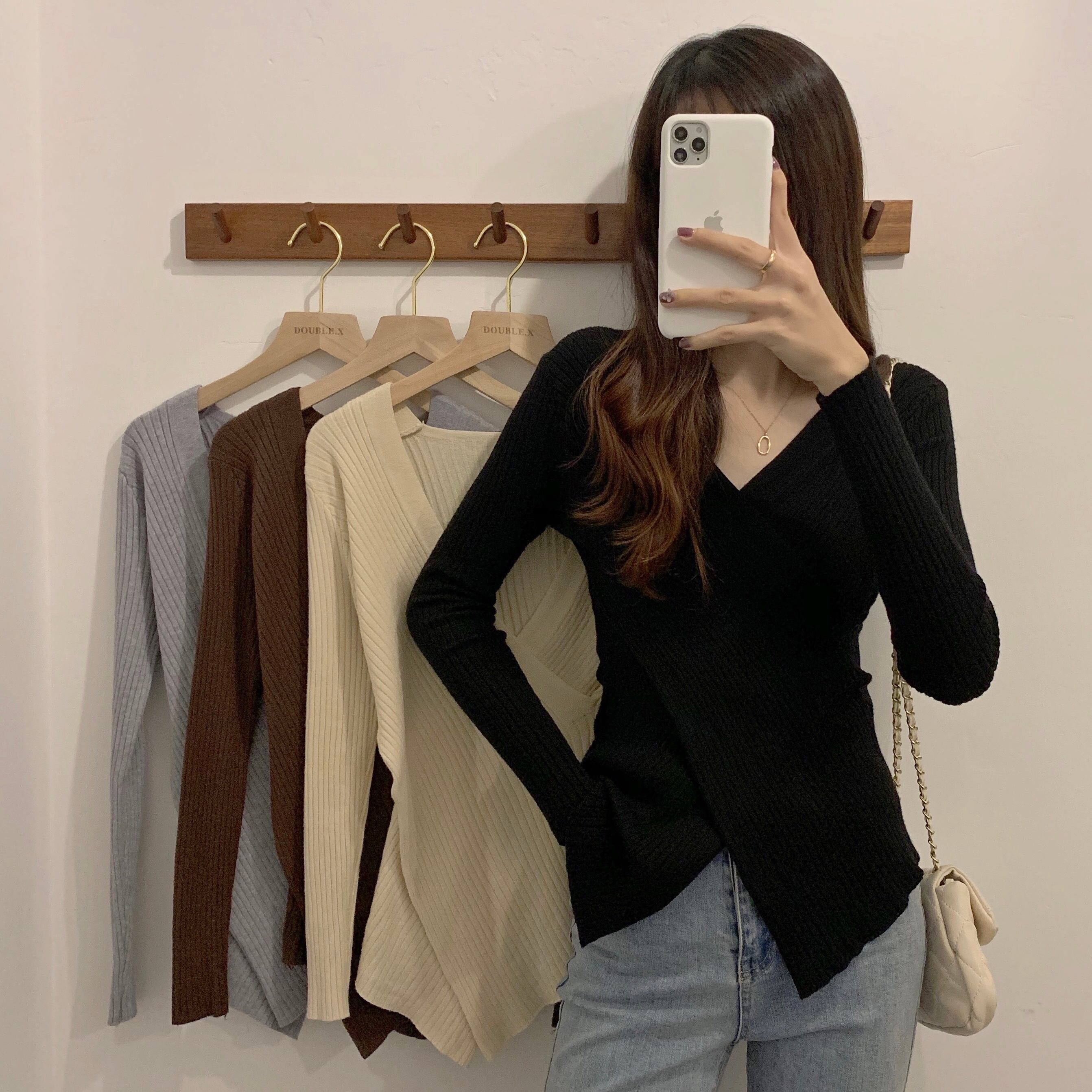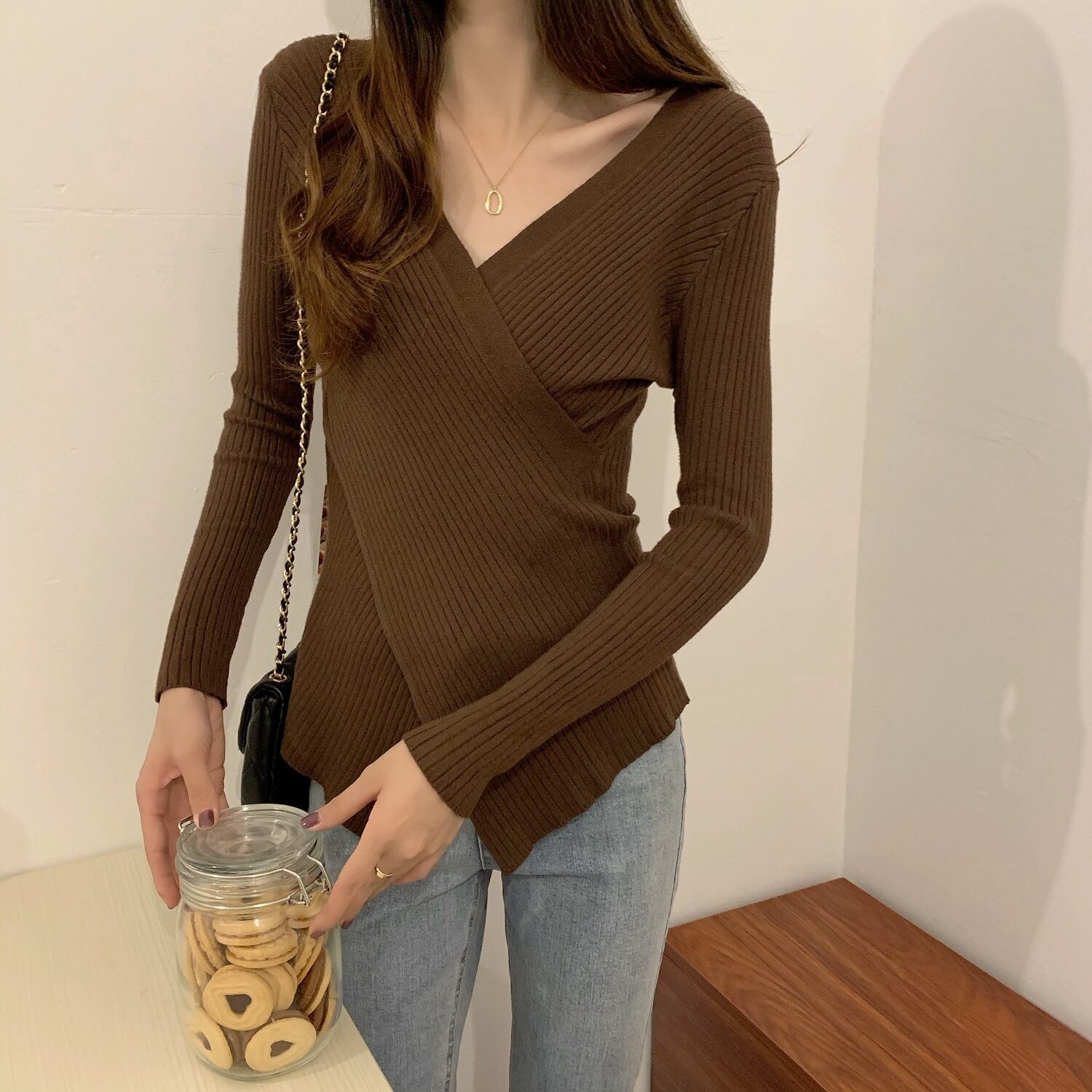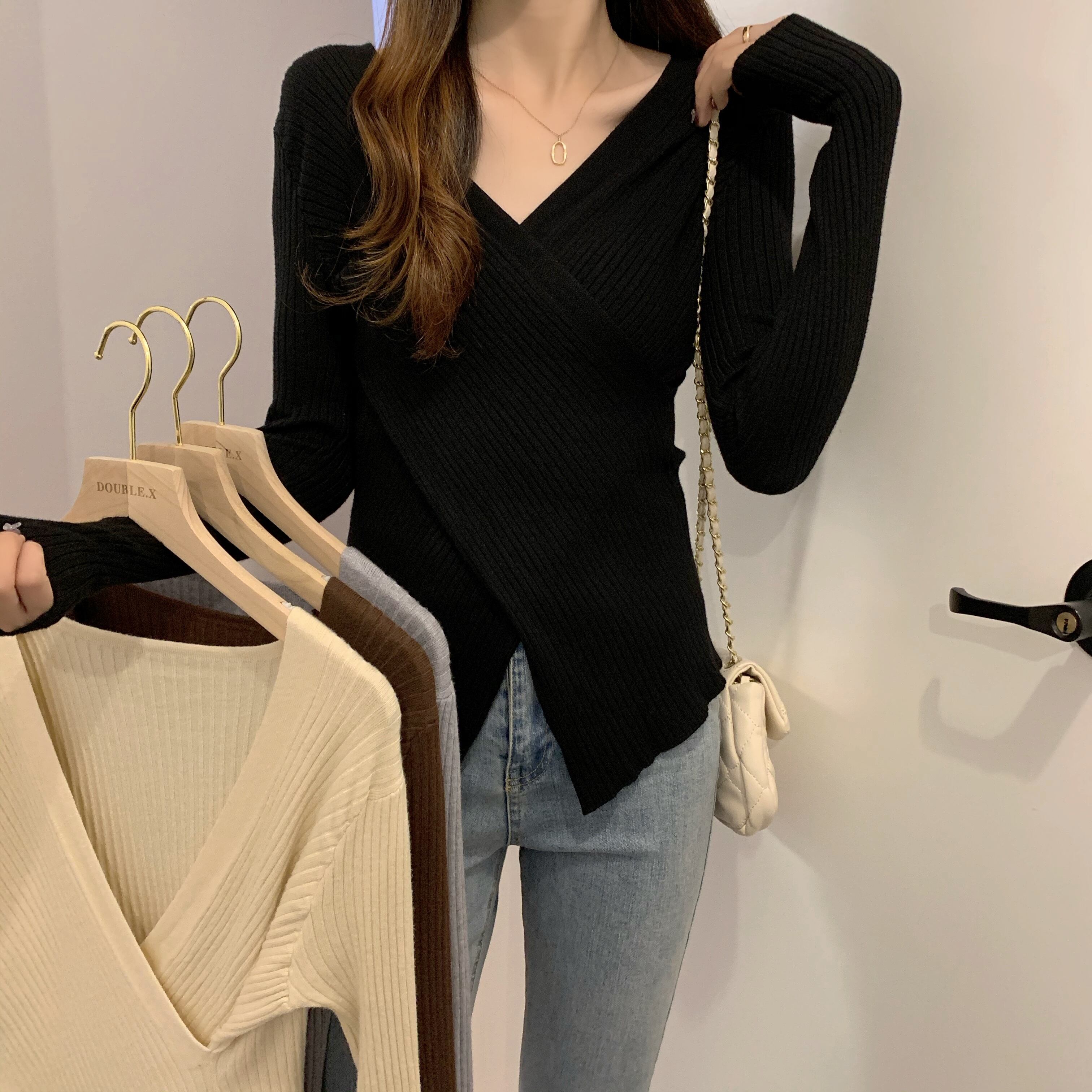 クロススリムVネックニットセーター 長袖スリーブプルオーバー ショートトップス ロング Xiaofeijia10698417604