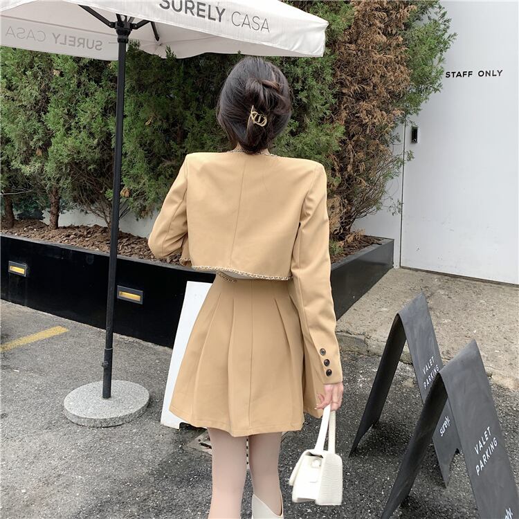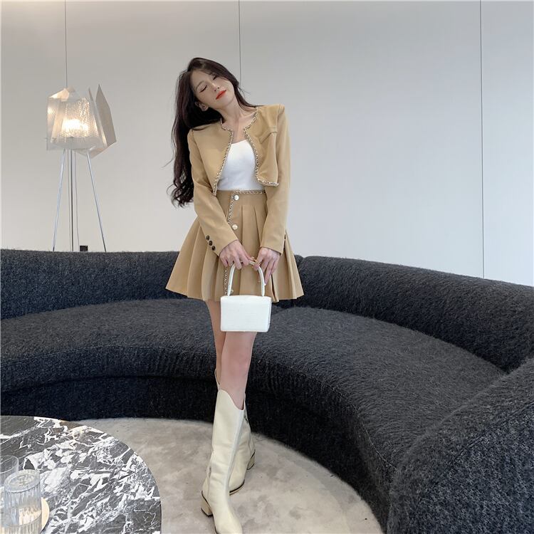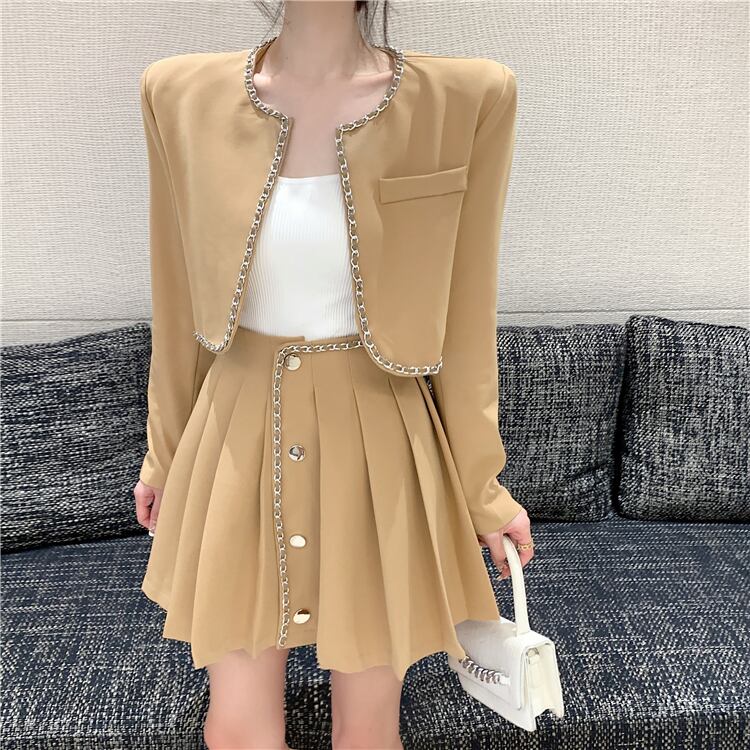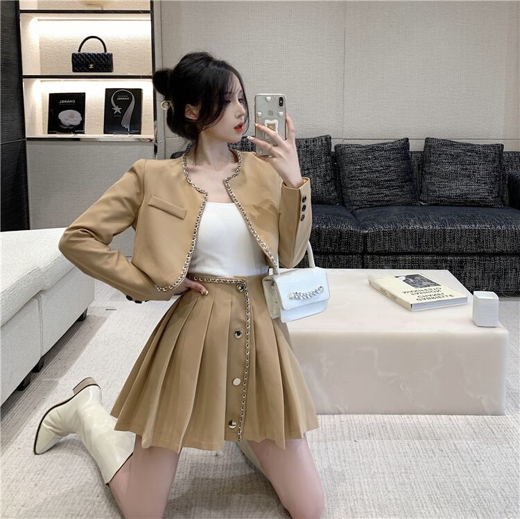 メタルチェーン ジャケット オータムハイウェストプリーツスカート ロング 秋物 Xiaofeijia82156810148