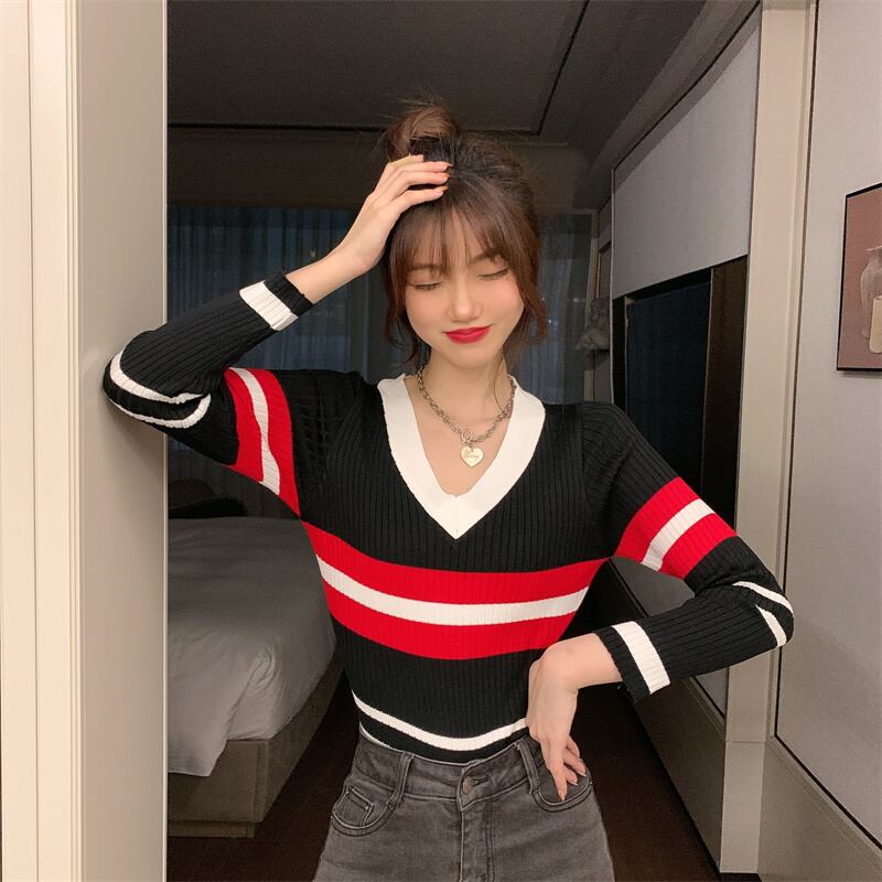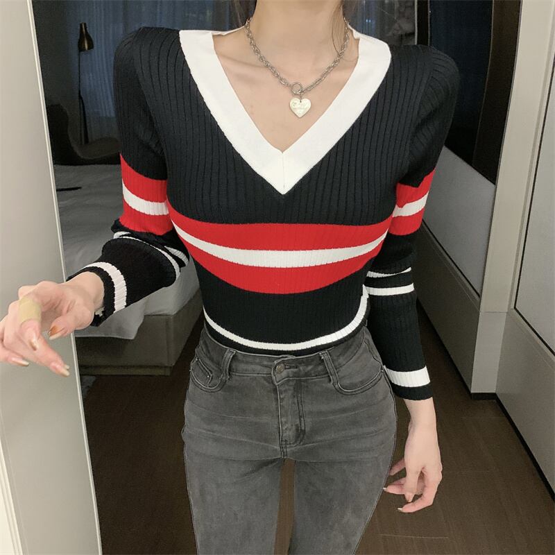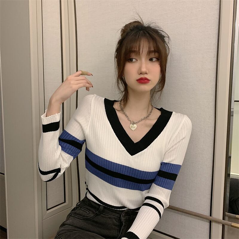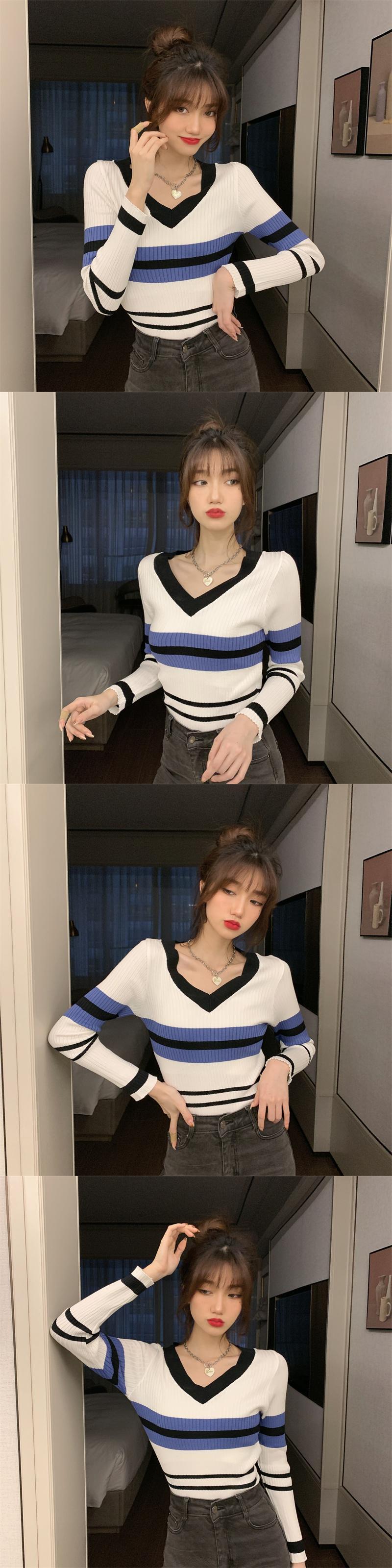 Vネックストライプスタイルニットセーター レディース ロング Xiaofeijia32307876266