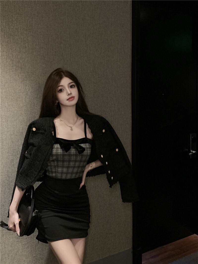 格子柄ドレス 薄手ツィードジャケット Xiaofeijia58966274107