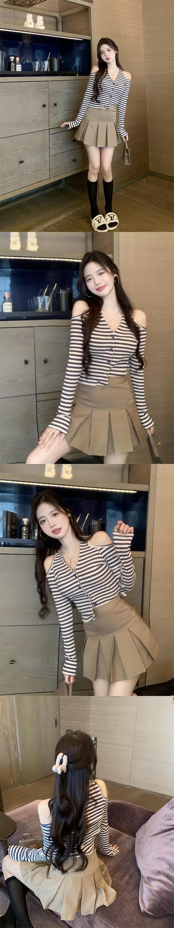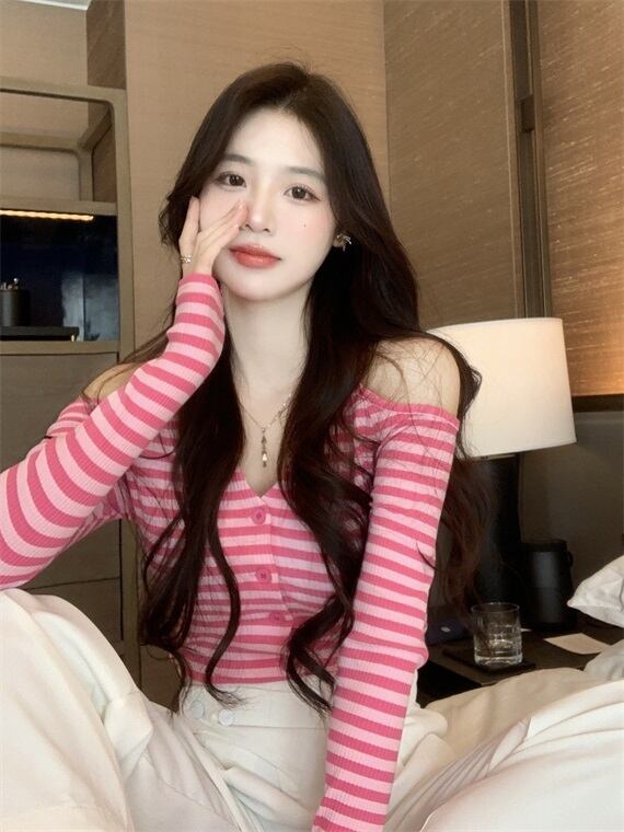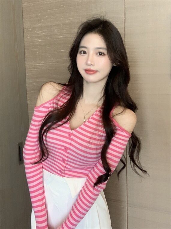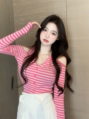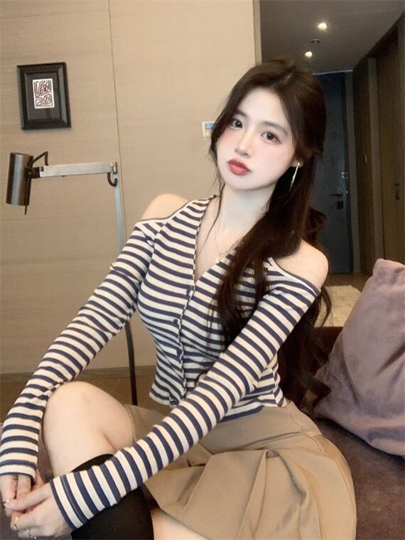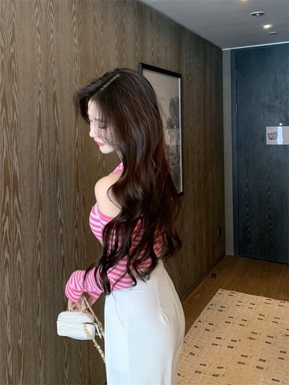 Vネックホルターストライプセーター ロング オフショルダー Xiaofeijia75053618424