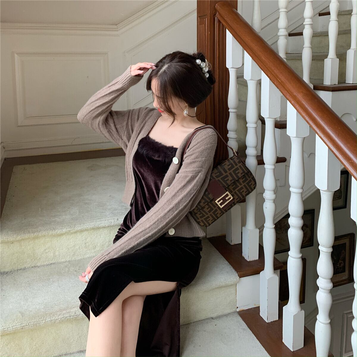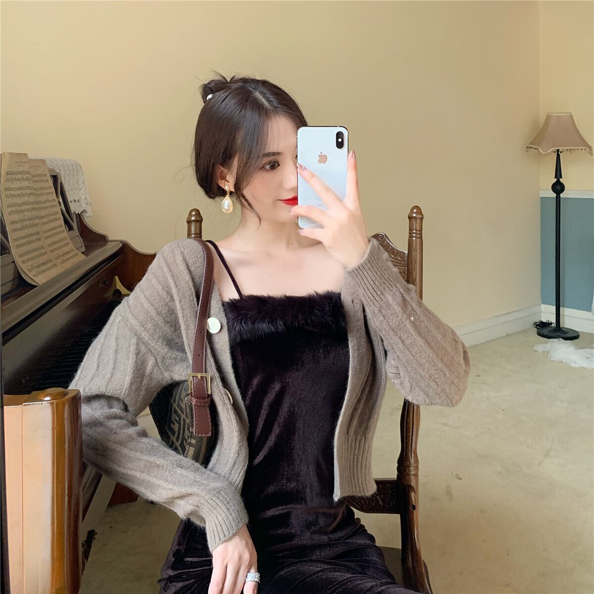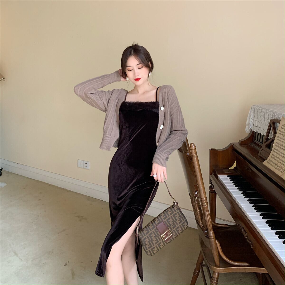 スタイルスタンダードオータムベルベットスカート スリムカラーセーター カーディガン レトロ 秋物 スクウェア Xiaofeijia57880997123