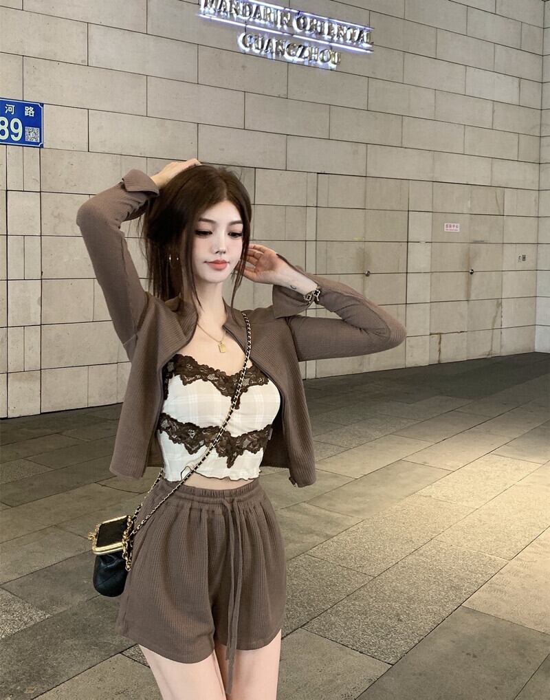 ジッパーカーディガンショートジャケット スタイルレディーススタンダードオータムショーツ セット レトロ 秋物 ブルマー Xiaofeijia67453659188