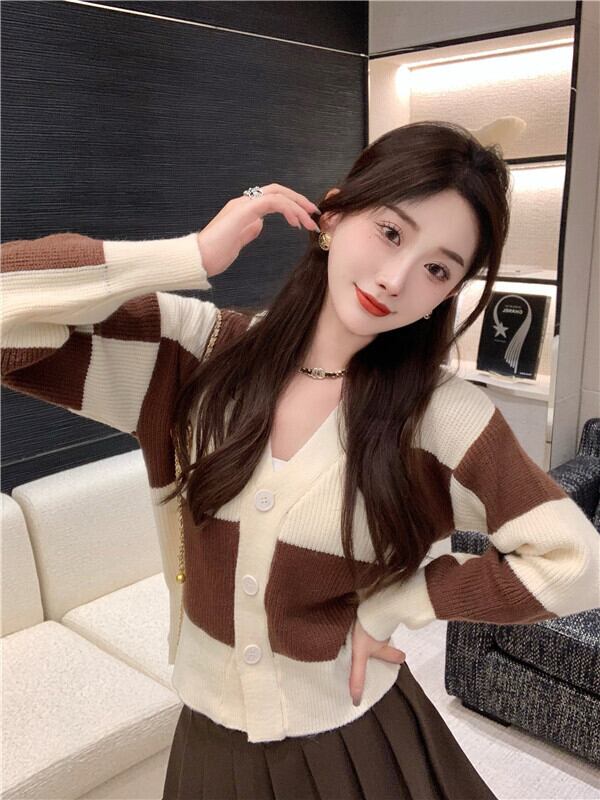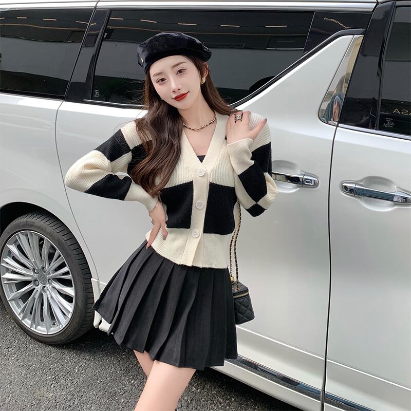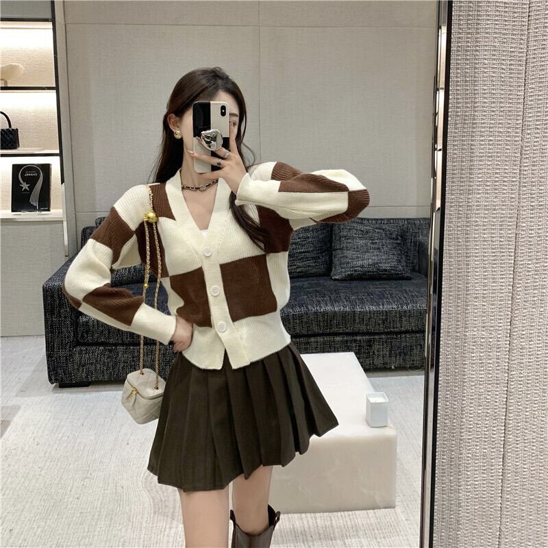 格子柄ニットカーディガンスタンダードスタイルセーター コート ハイウェストウェストプリーツスカート レトロ Xiaofeijia23696581773