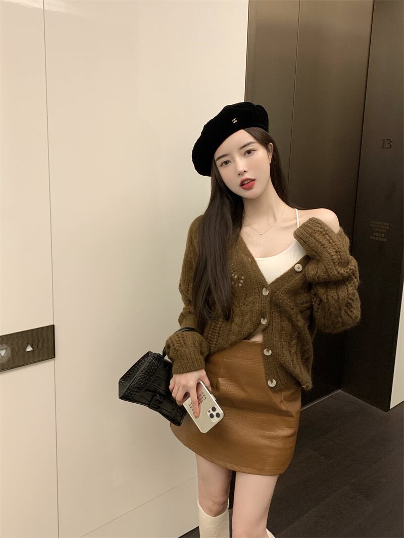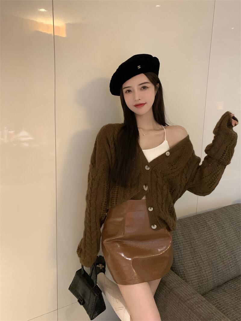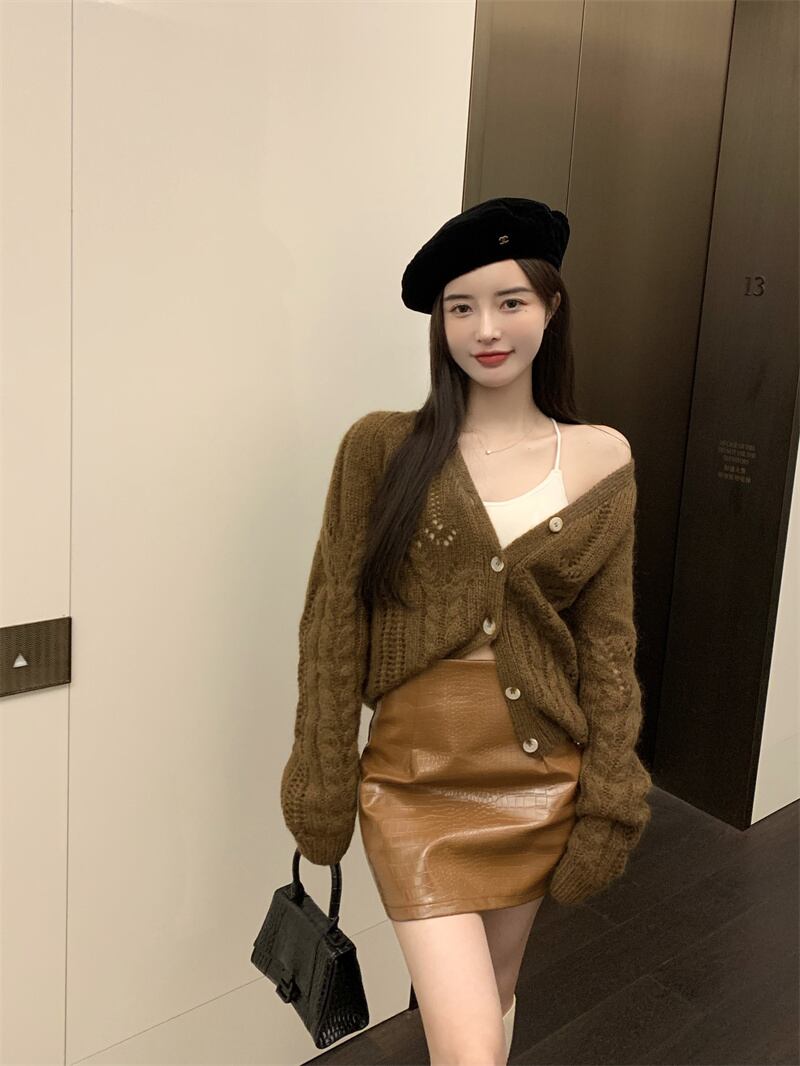 Vネックカーディガンニットセーター ブラウンスカート Xiaofeijia31573117677
