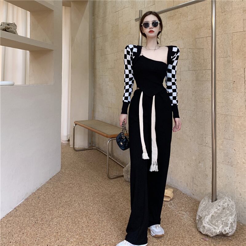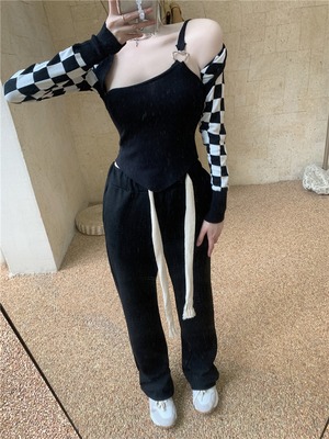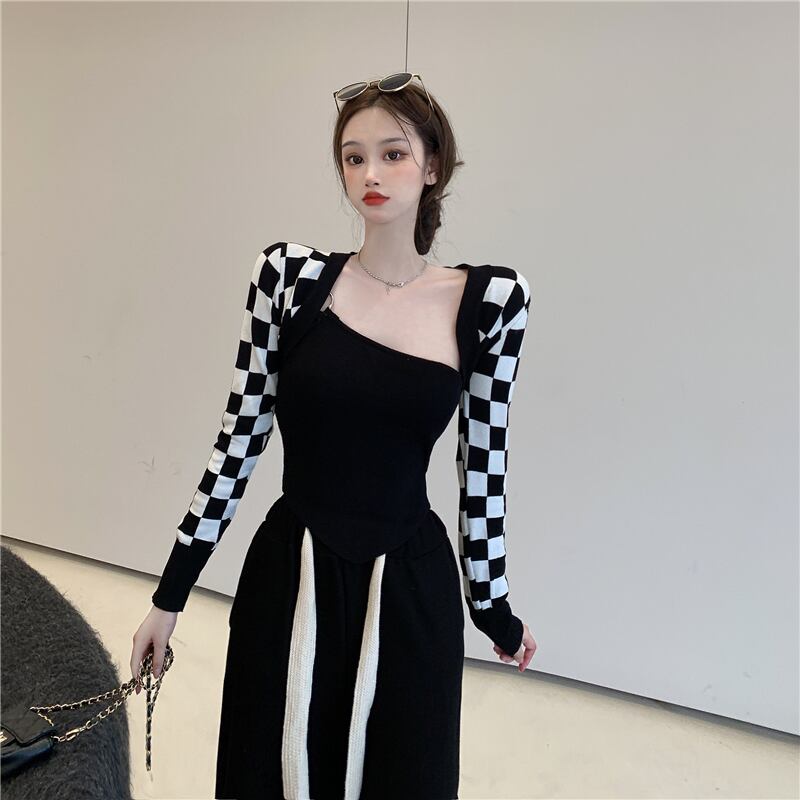 ブラックホワイト格子柄ショートオータムトライアングル 秋物 Xiaofeijia11861042779