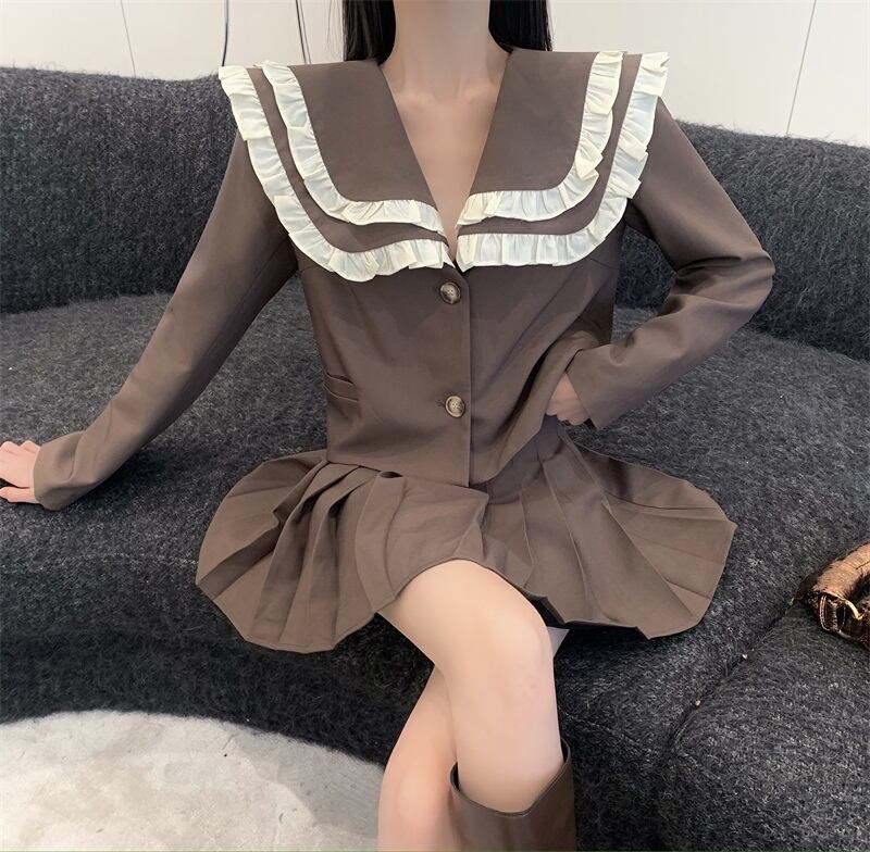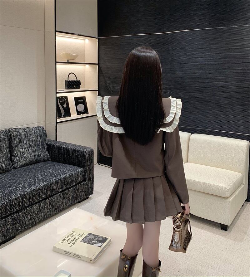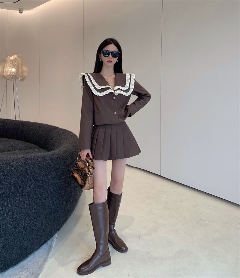 スタンダードダブルカラーショートコート ハイウェストウェストプリーツスカート オータムセット レトロ 秋物 Xiaofeijia3142513546