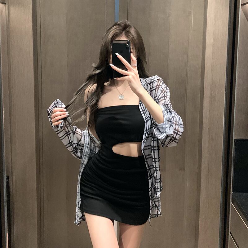 薄手格子柄シャツ スカート サマールーズウェストトップス ドレス ロング 夏物 Xiaofeijia75900512866