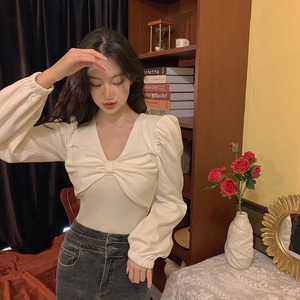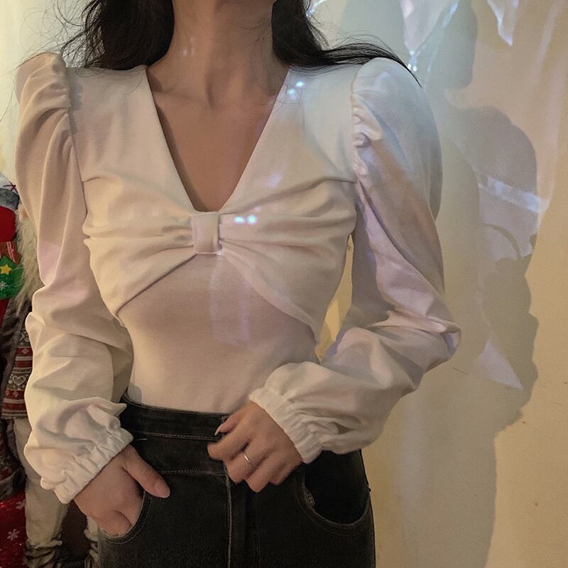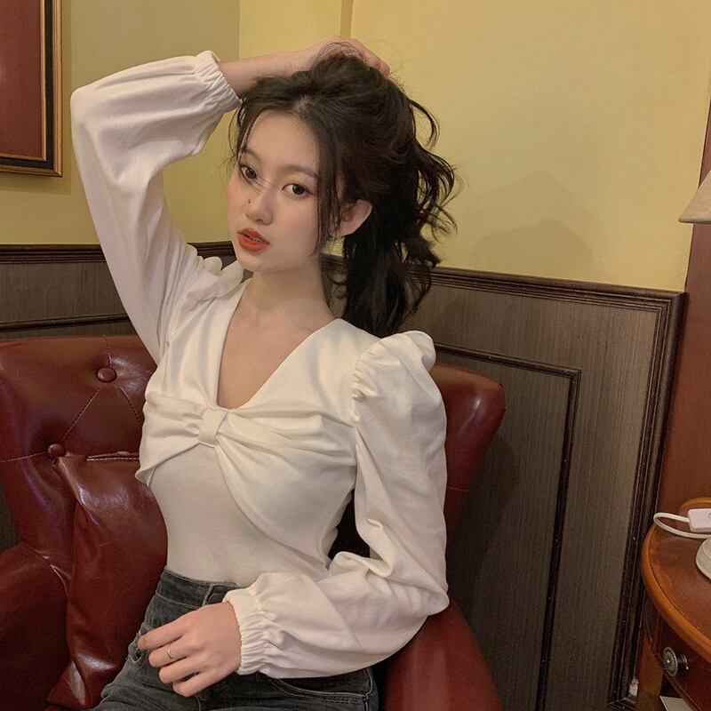 シャツ スタイルVネックスリーブトップス スリムショートホワイトオータム 秋物 Xiaofeijia13173982889