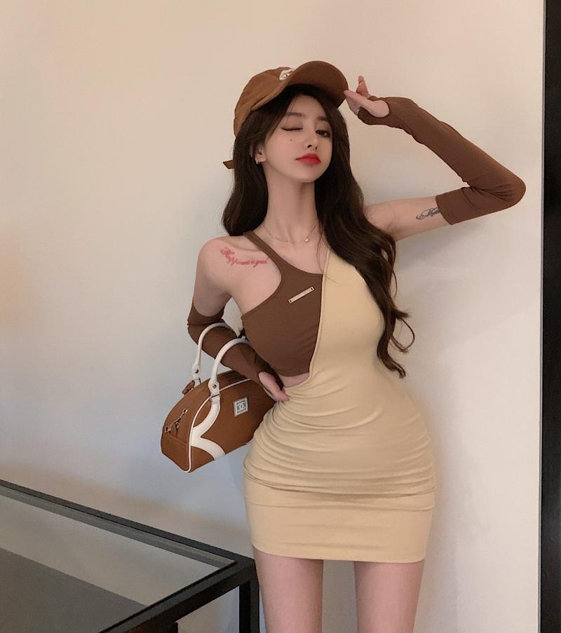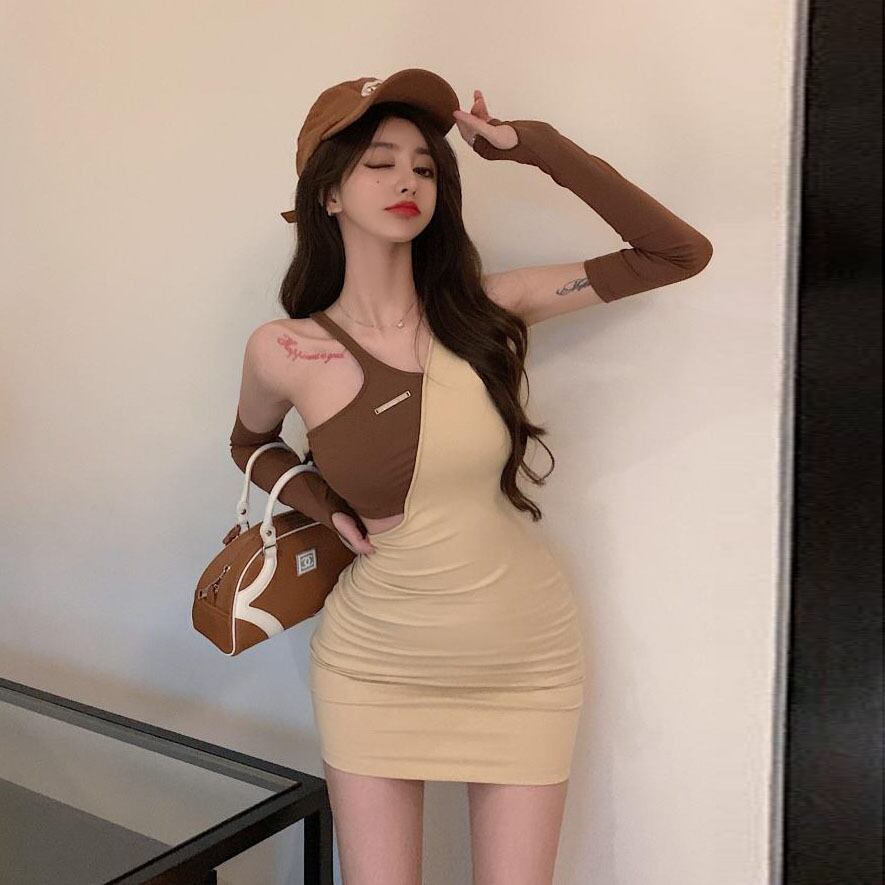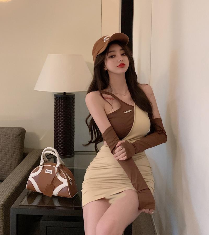 オータムストラップレスVネックドレス ショートスカート ロング 秋物 ステッチ Xiaofeijia15240821725