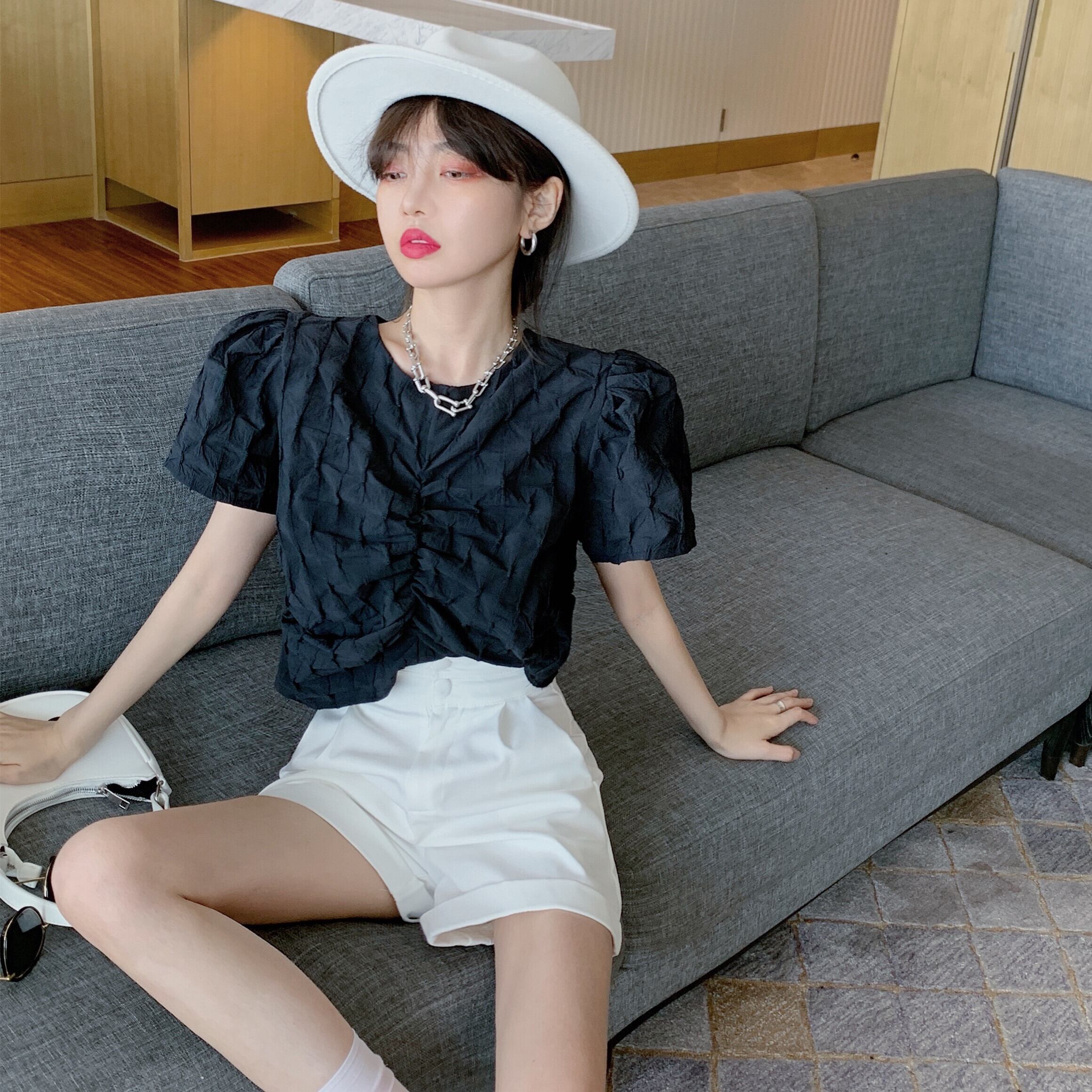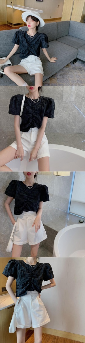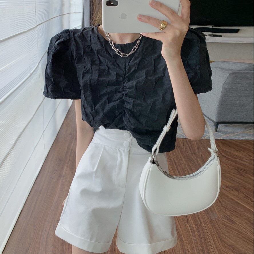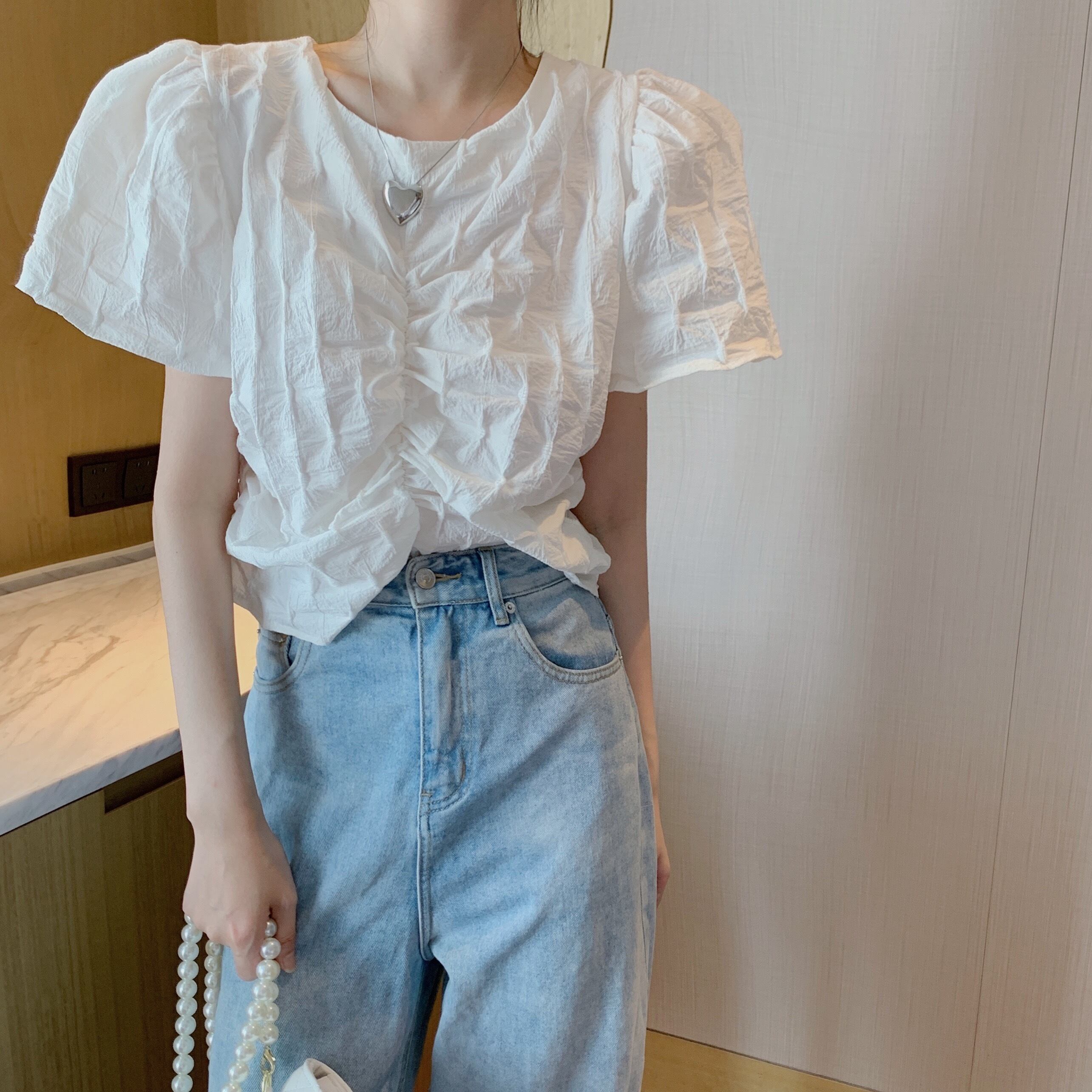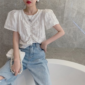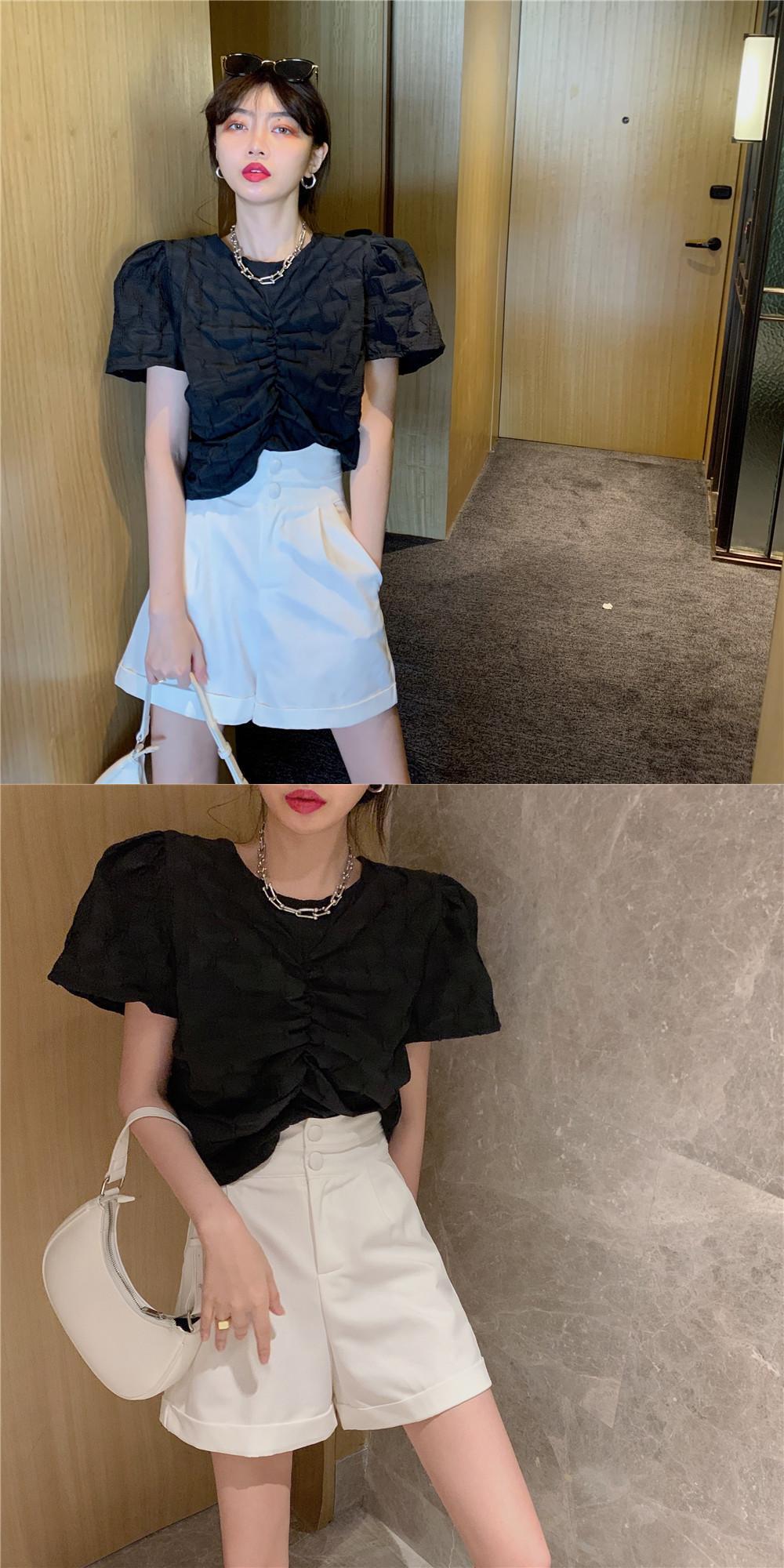 ラウンドネックスリーブプリーツシャツ レディースサマースタイルソリッド カラーショートトップス 夏物 Oネック ソリッドカラー Xiaofeijia68047000103