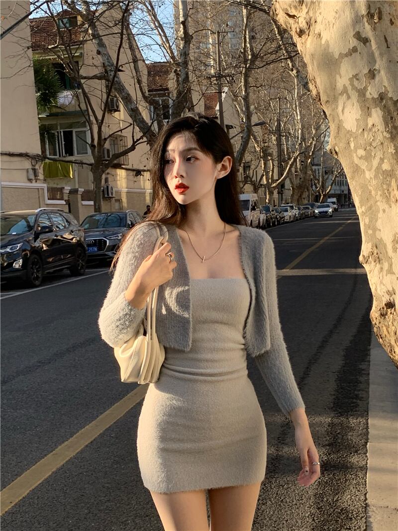 色:グレーのチューブトップスカート,グレーのカーディガン
