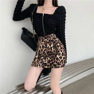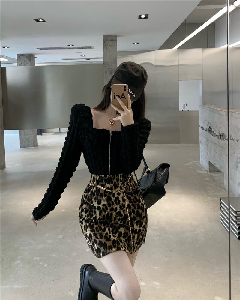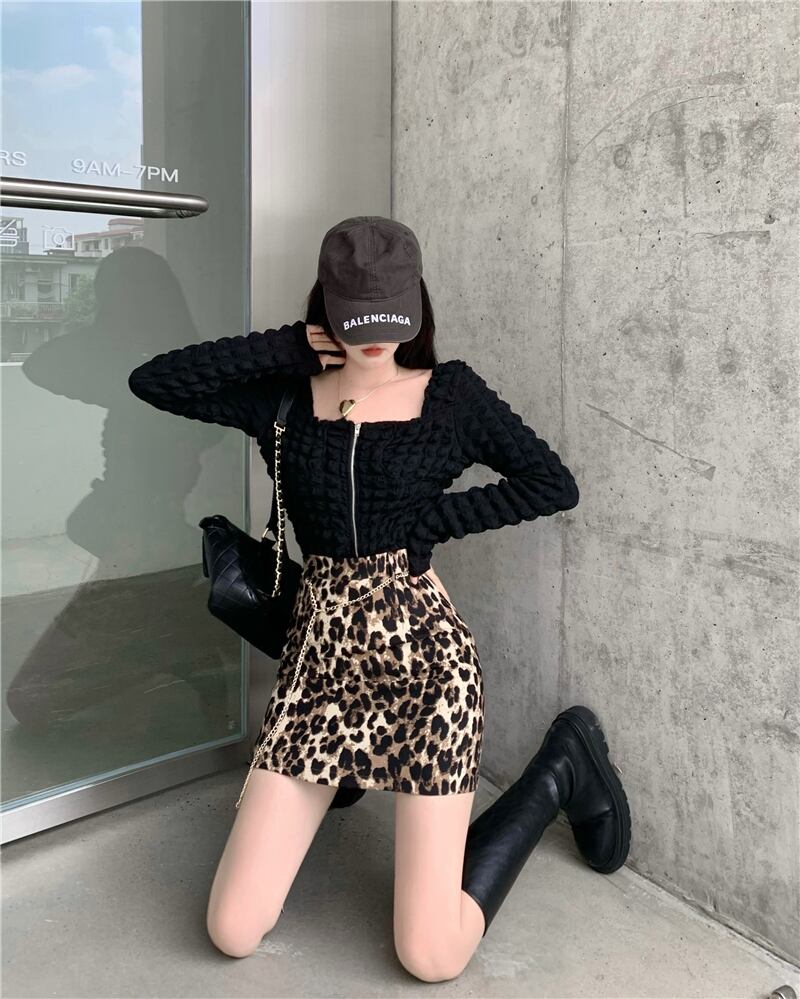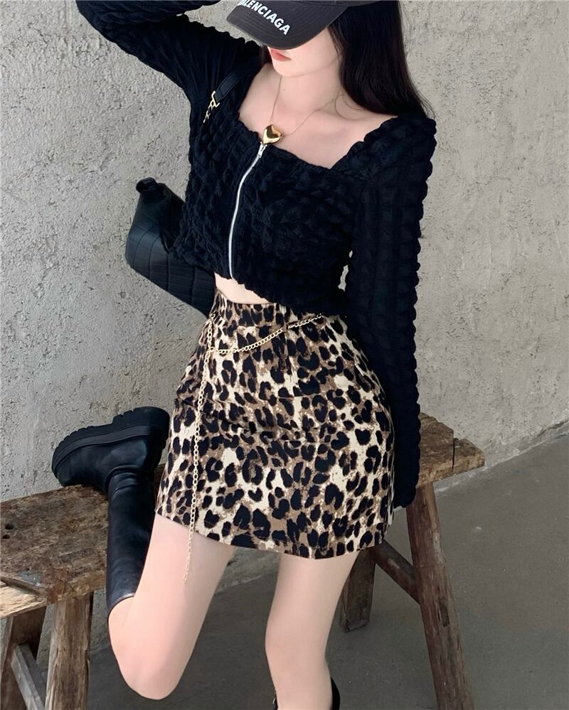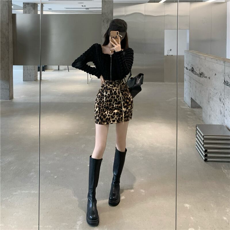 長袖スリーブジッパーカーディガンハイウェストウェストレオパードスカート ロング スクウェア Xiaofeijia75207295921