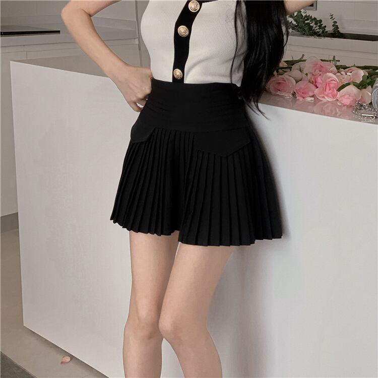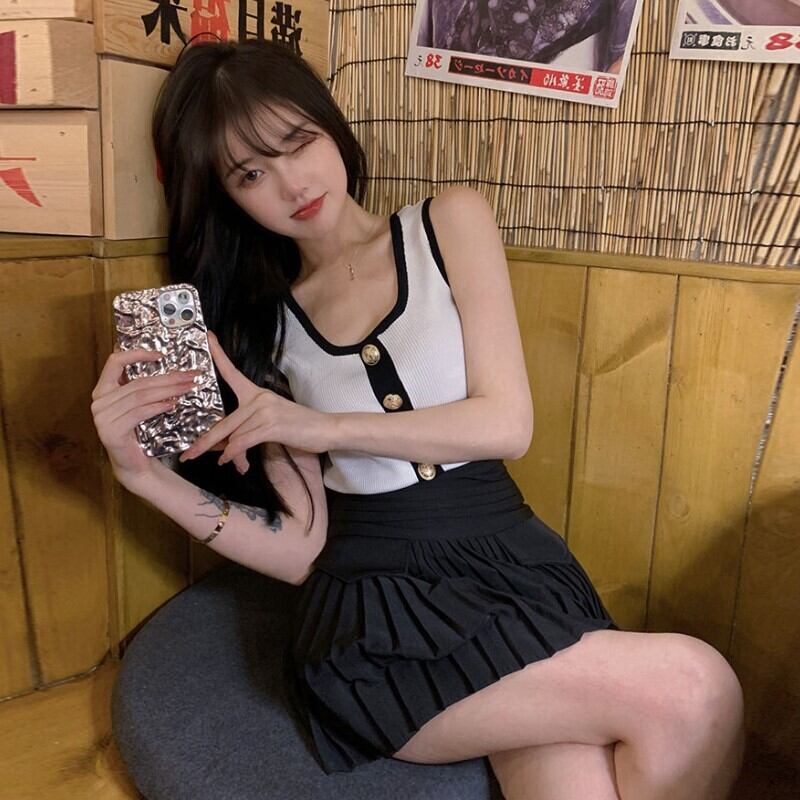 ブラックホワイトサマーメタルバックルニットハイウェストウェストプリーツスカート 夏物 スクウェア Xiaofeijia25868533145