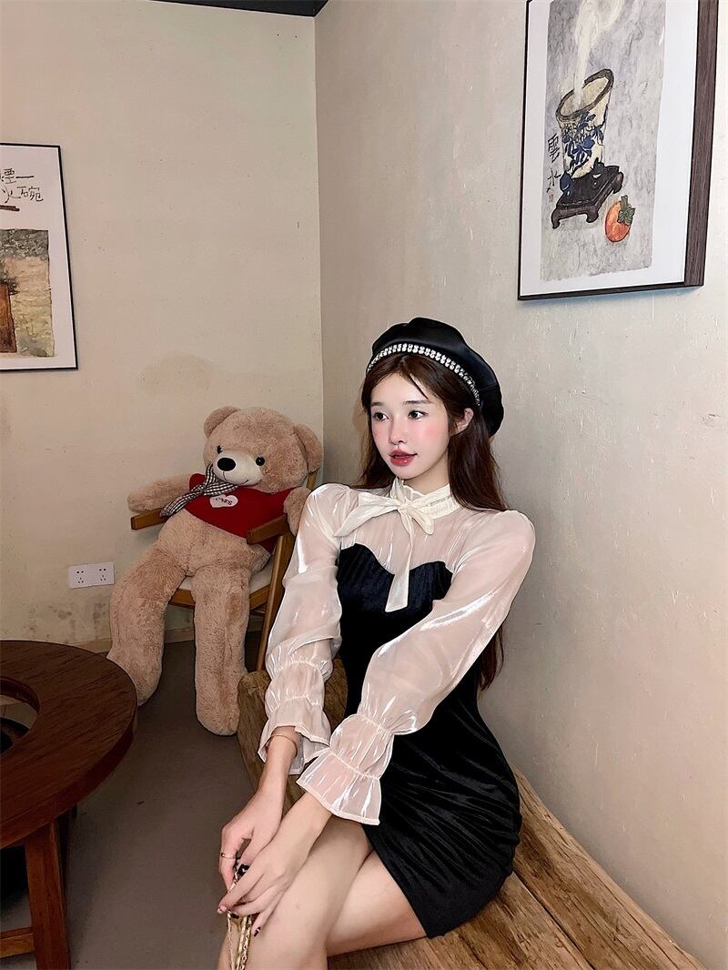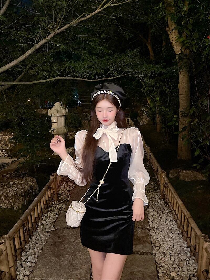 オータムシャツ ベルベットドレス リボン 秋物 ステッチ Xiaofeijia7180980365