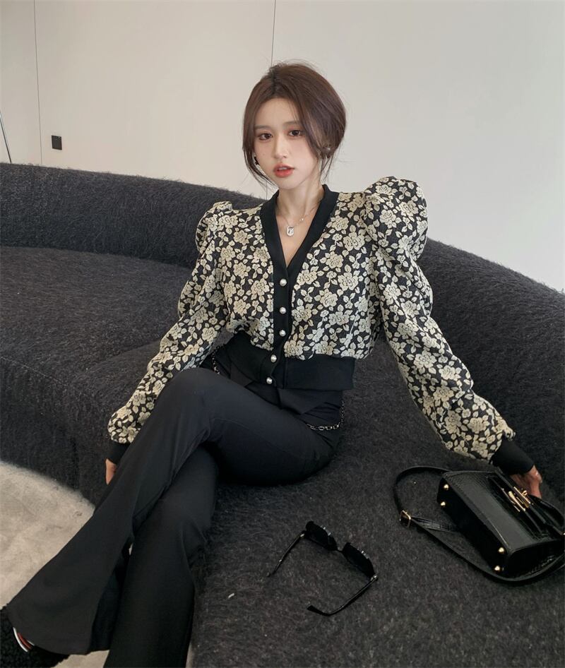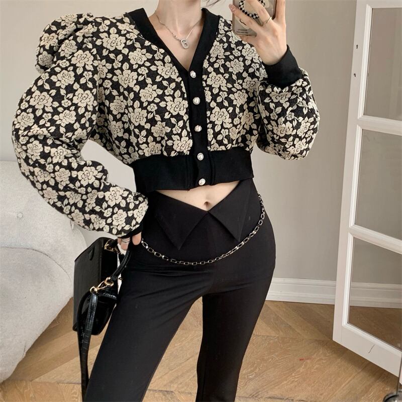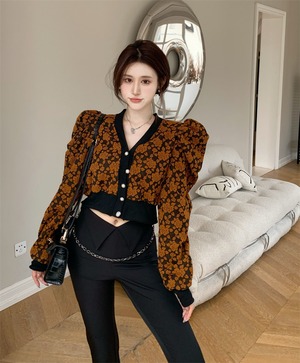 スタンダードジャカードVネックショートスリーブカーディガン レトロ Xiaofeijia49881044042
