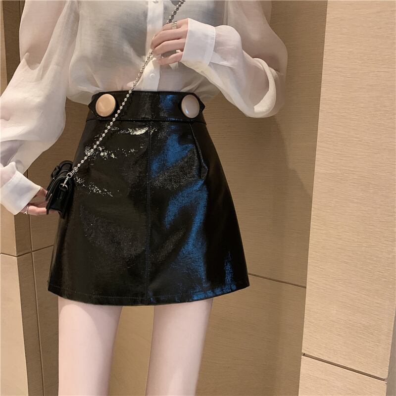レザースカート 薄手ハイウェストウェストAラインショートオータム 秋物 Xiaofeijia35042433013