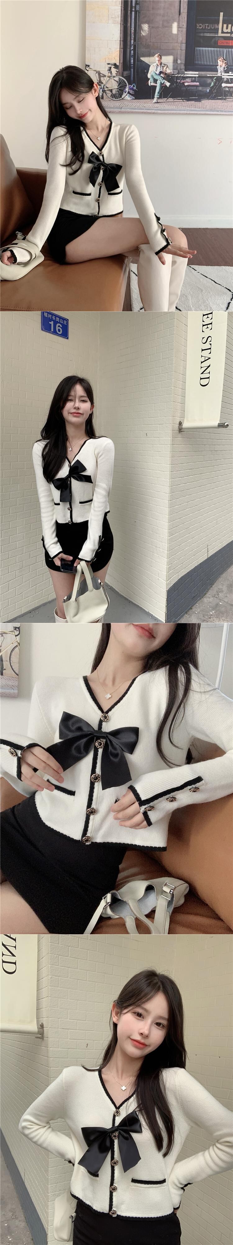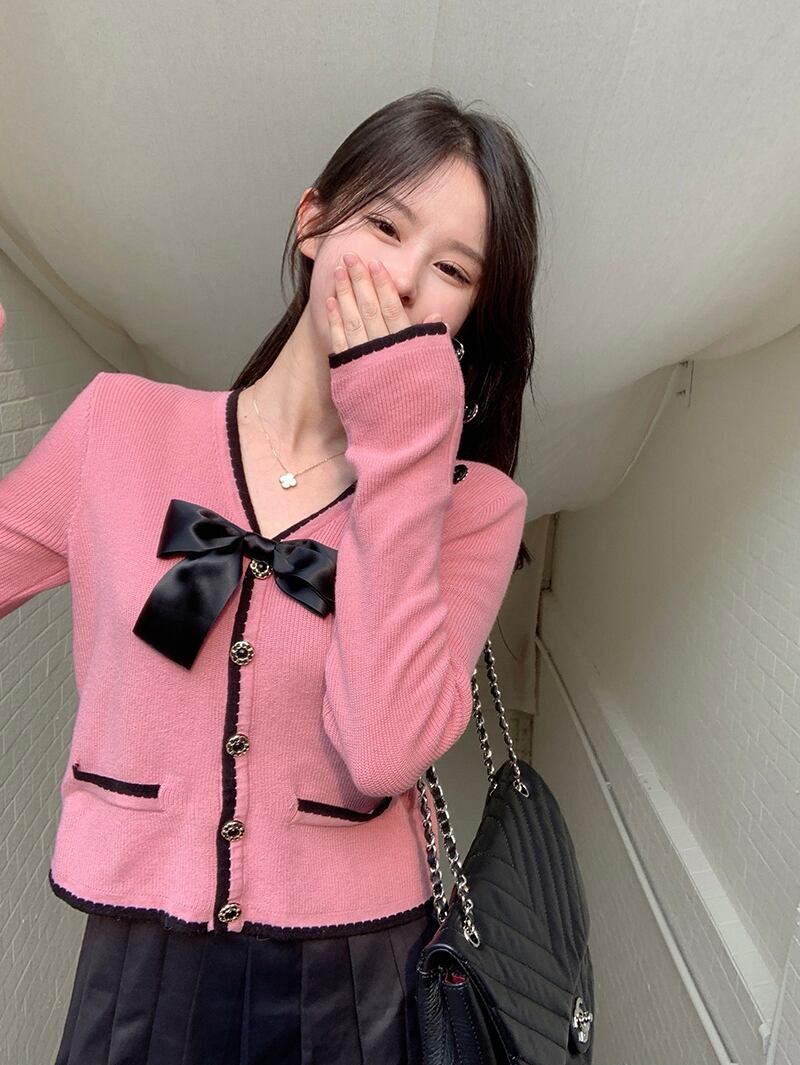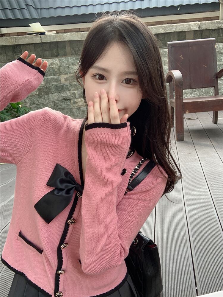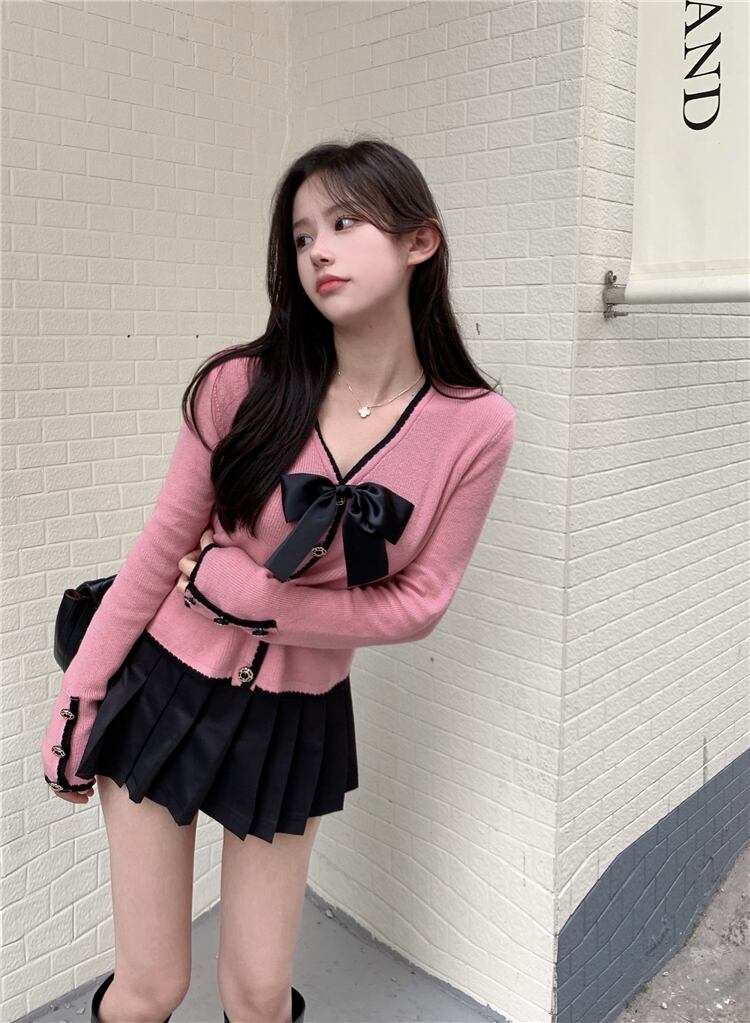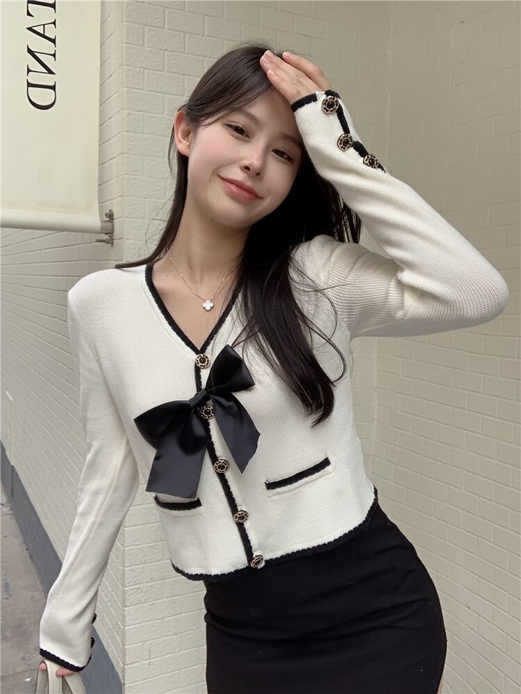 Vネックショートコート リボンニットセーター トップス レディースオータム ロング 大人ガーリー スウィート キュート カジュアル 秋物 Xiaofeijia89227710274