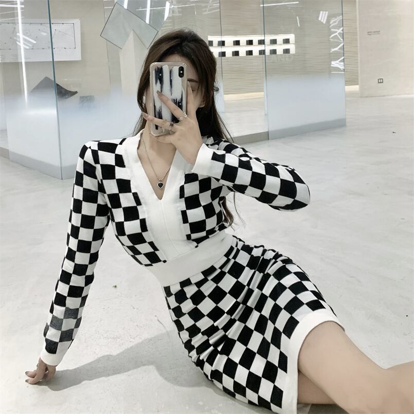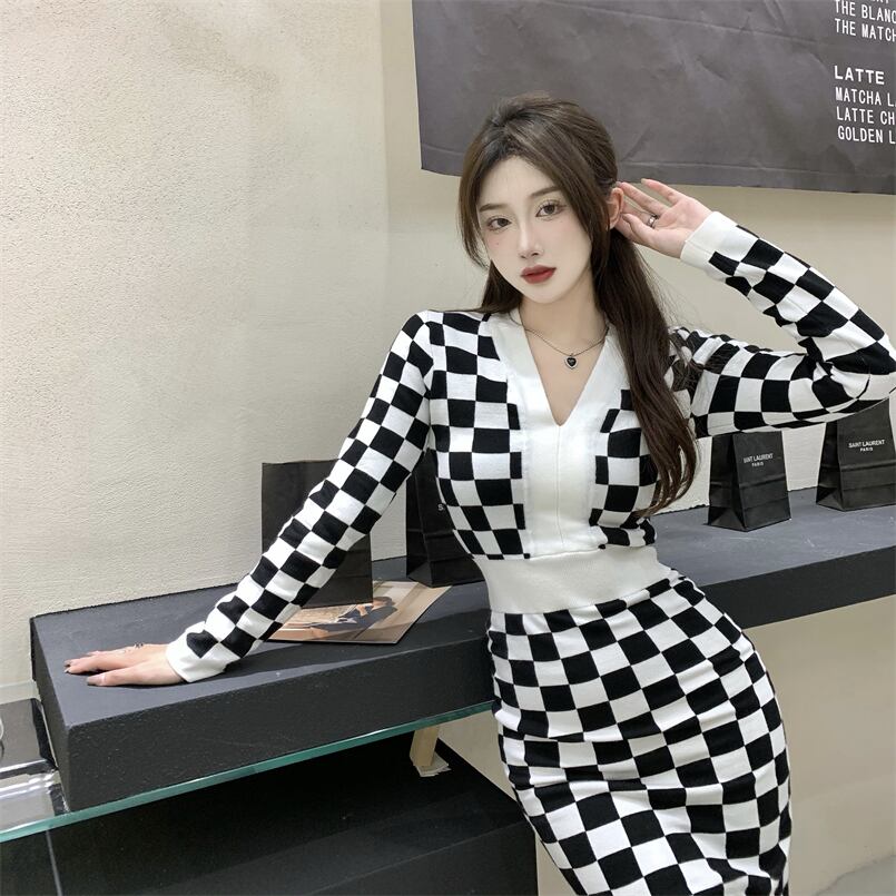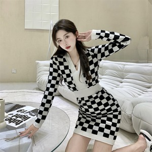 スリムブラックホワイトニットドレス レディース Xiaofeijia71472199339