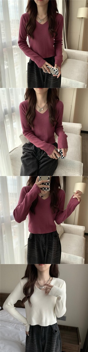 オータムウィンターVネックスリムソリッド カラーショートニットセーター トップス 秋物 冬物 ソリッドカラー Xiaofeijia74643454850