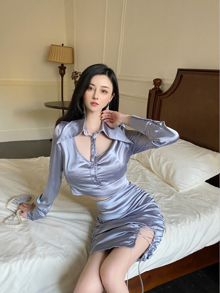 オータムサテンカラーシャツ プリーツラインストーンウェストスカート 秋物 Xiaofeijia31408181594
