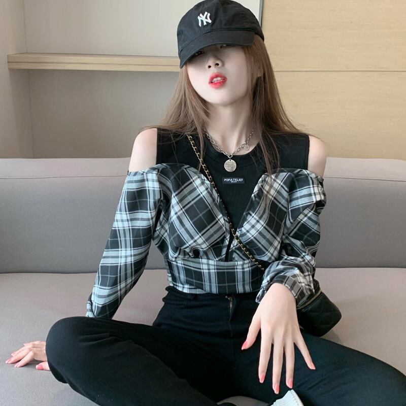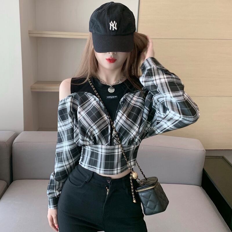 格子柄シャツ ショートトップス ロング ステッチ Xiaofeijia36998876299