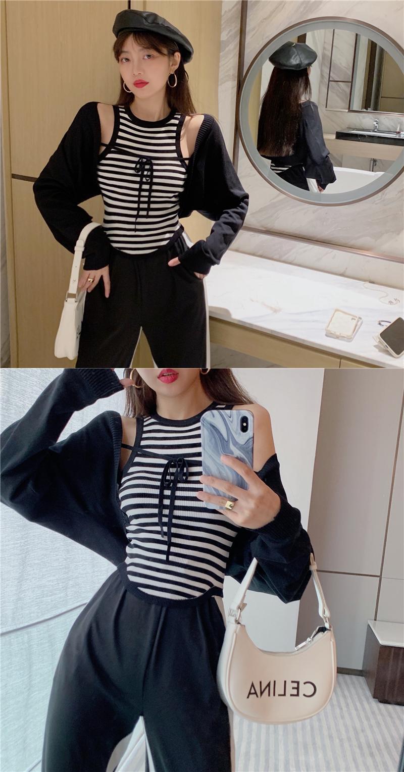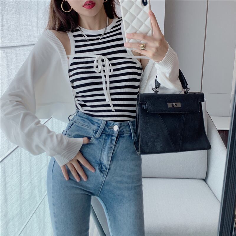 スタンダードストライプトップス ショートニットカーディガンホワイトブラウス レトロ Xiaofeijia34624104737