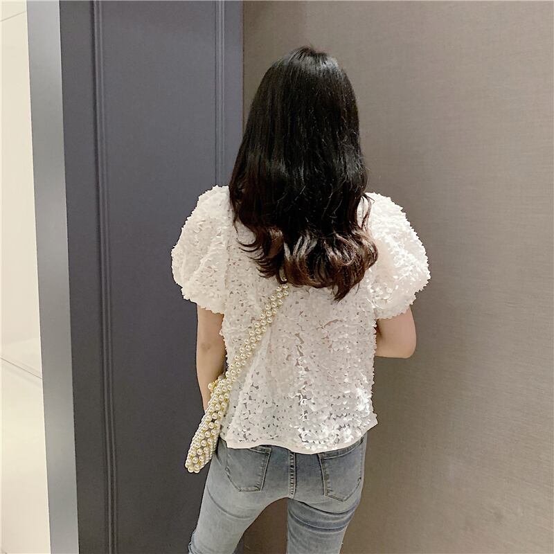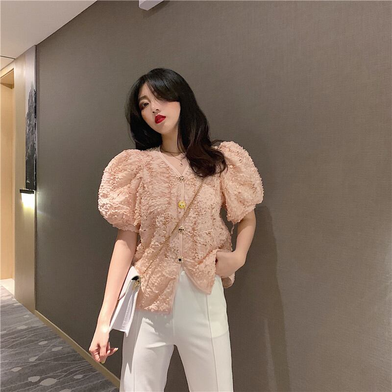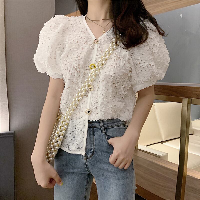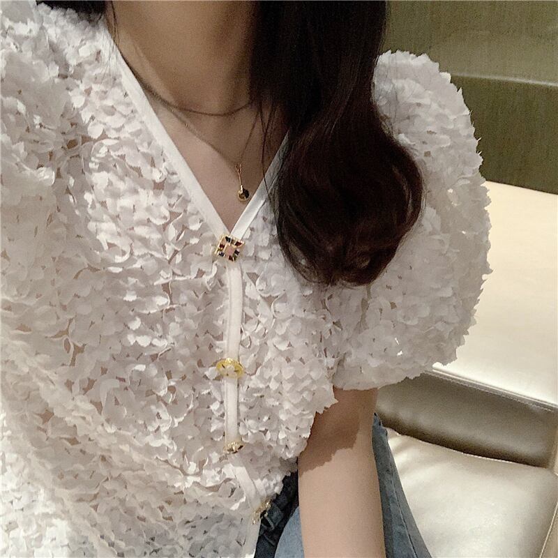 オータムブラウス VネックFlowerデザイン シフォンシャツ ホワイトルーズレース レッド 刺繍 大人ガーリー スウィート キュート カジュアル 秋物 フラワーデザイン Xiaofeijia54775527374