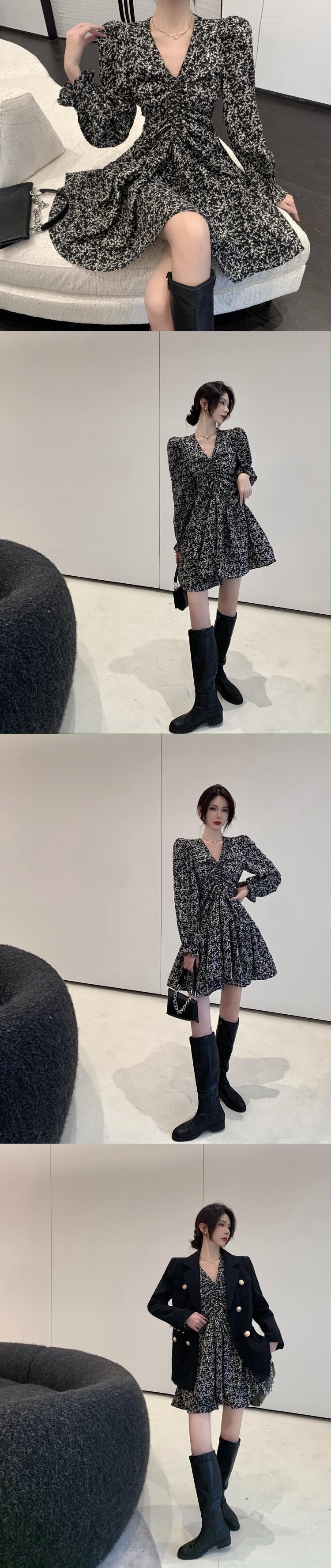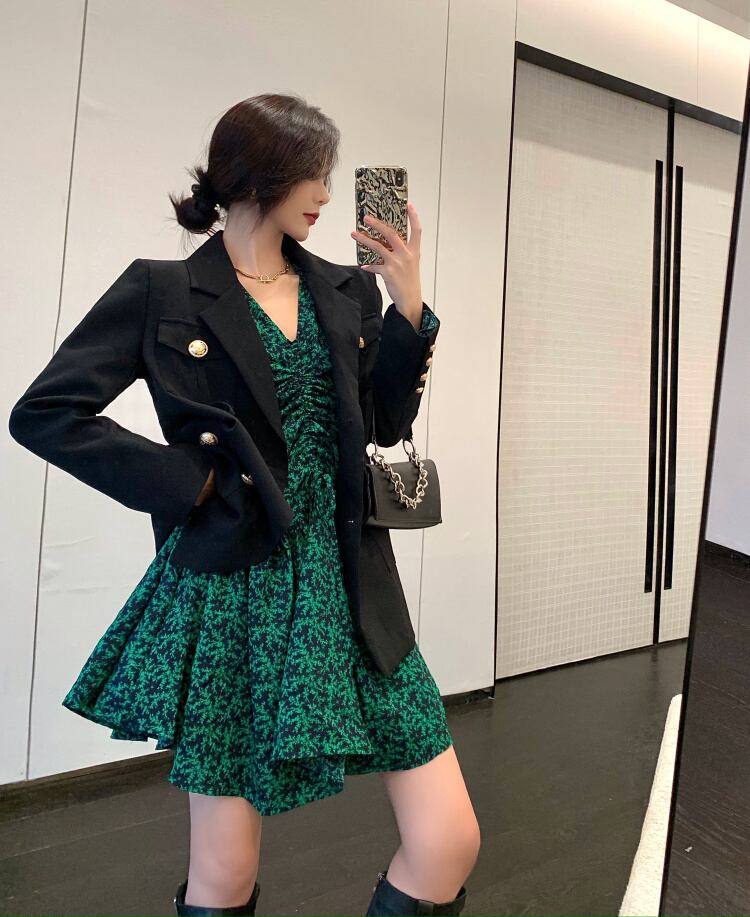 フローラルスカート Vネックウェストスリーブドレス オータムスタンダードグリーンショート レトロ 秋物 花柄 Xiaofeijia33754310337