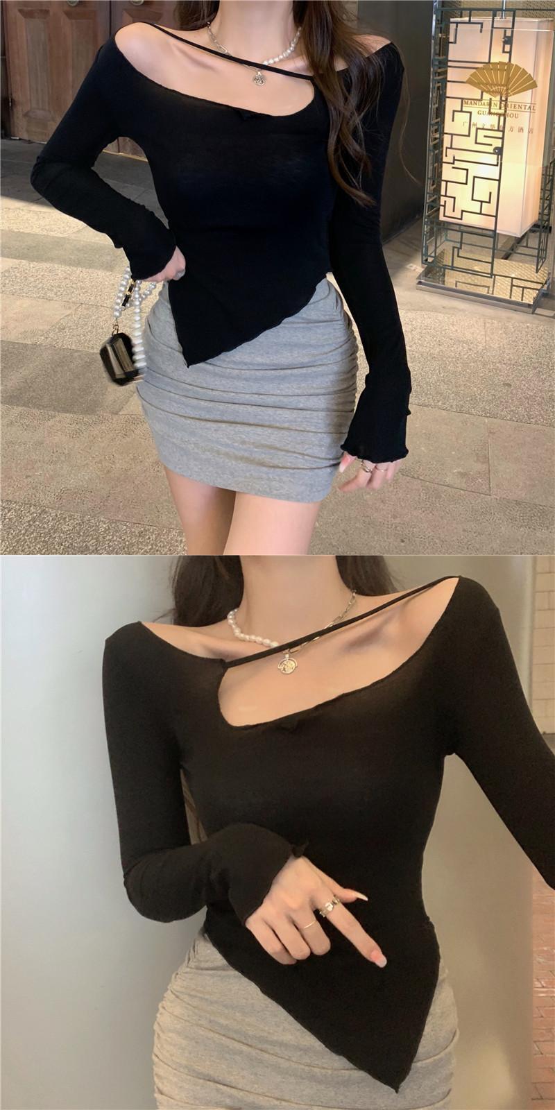 オータムトップス スリムブラックストラップレスTシャツ シャツ 薄手 ロング 秋物 ピュア Xiaofeijia76152539362