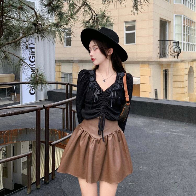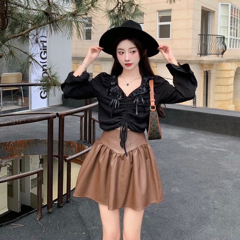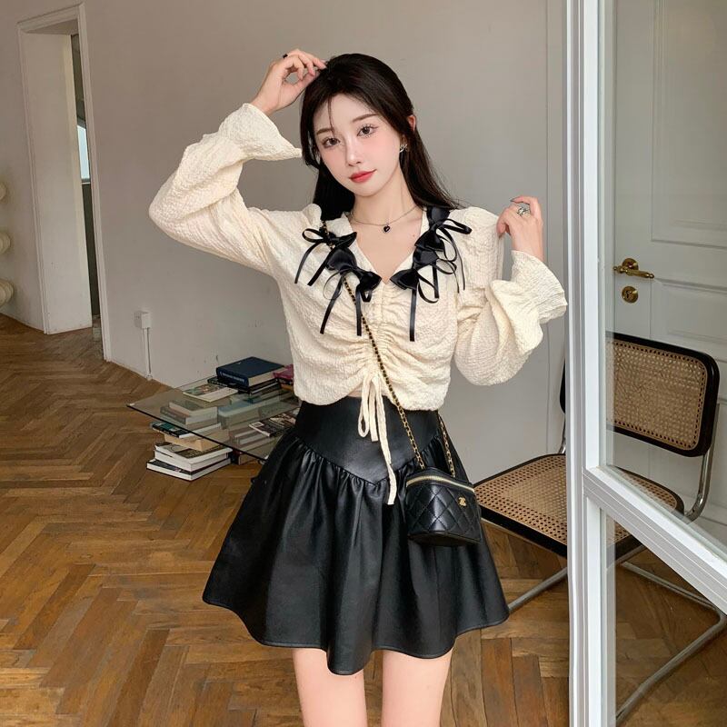 オータムVネックリボンシャツ レディースギャザーショートプリーツトップス ロング 秋物 Xiaofeijia23731690159