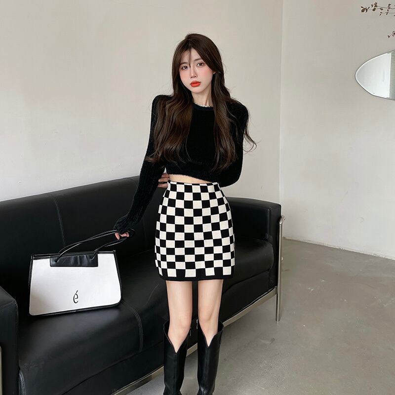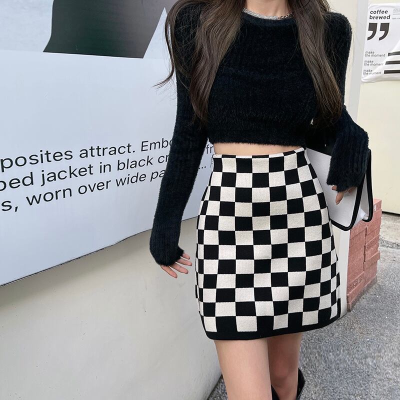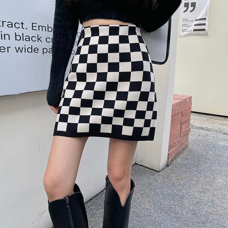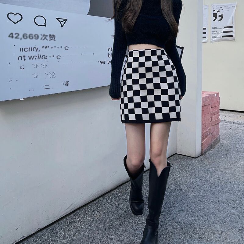 ニットスカート オータムスタンダード格子柄ハイウェストウェストスリム レトロ 秋物 Xiaofeijia88551979972
