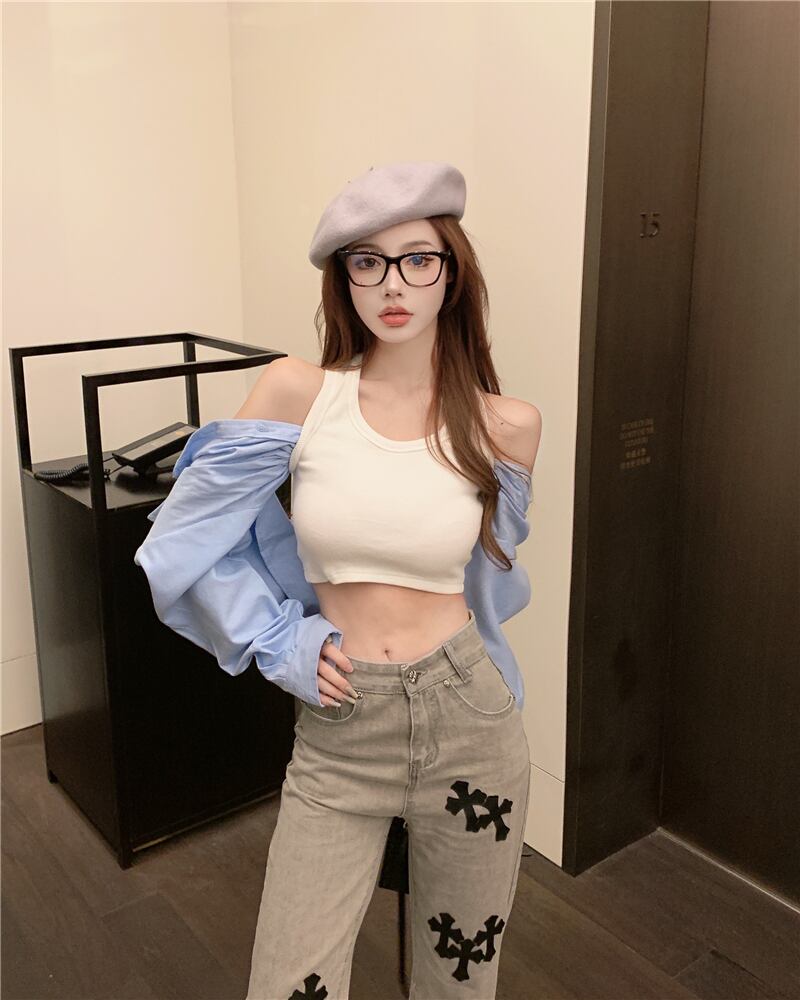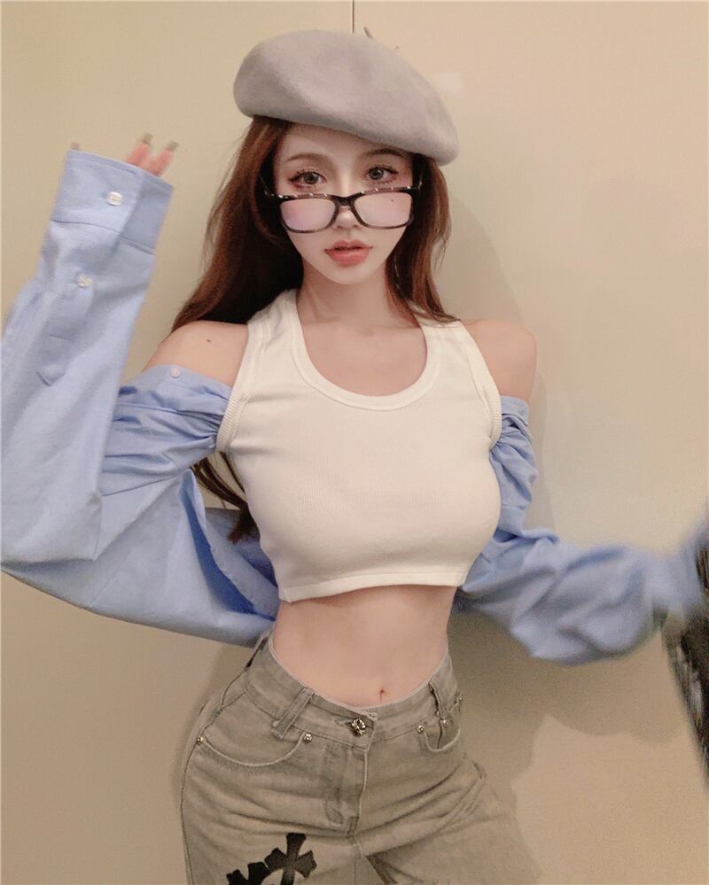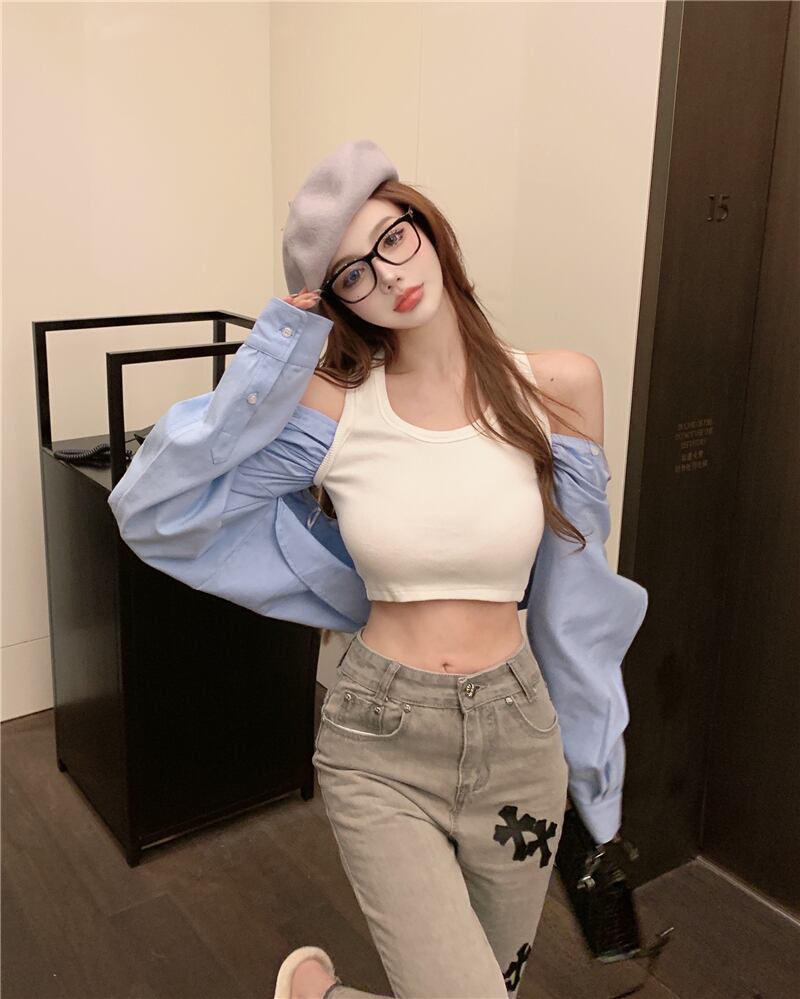 スタイルカラーシャツ トップス スプリングオータム ロング 春物 秋物 オフショルダー ステッチ Xiaofeijia24099914751