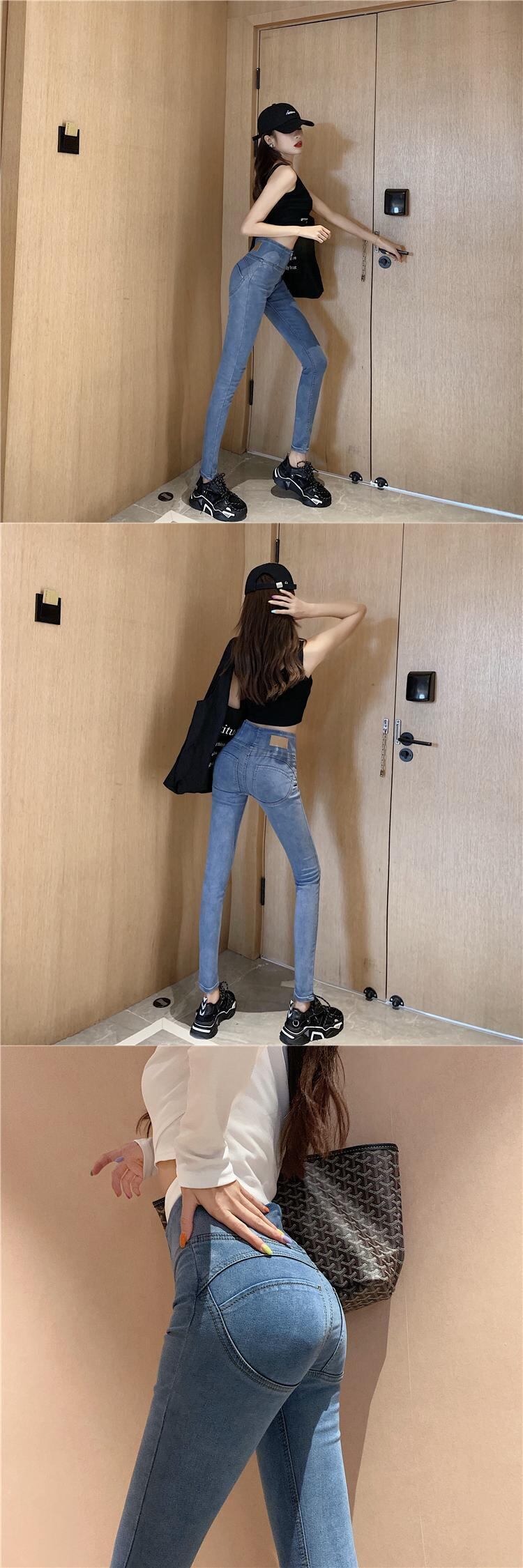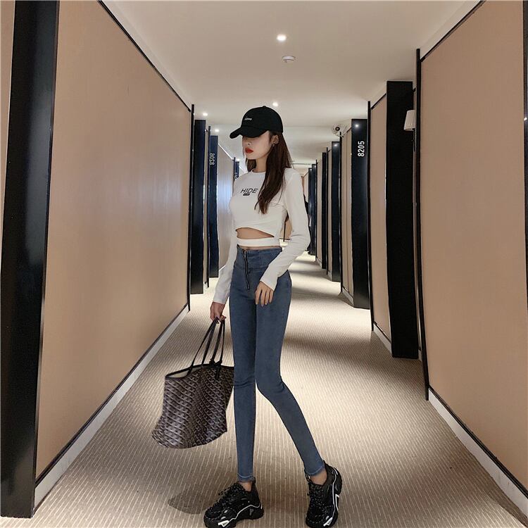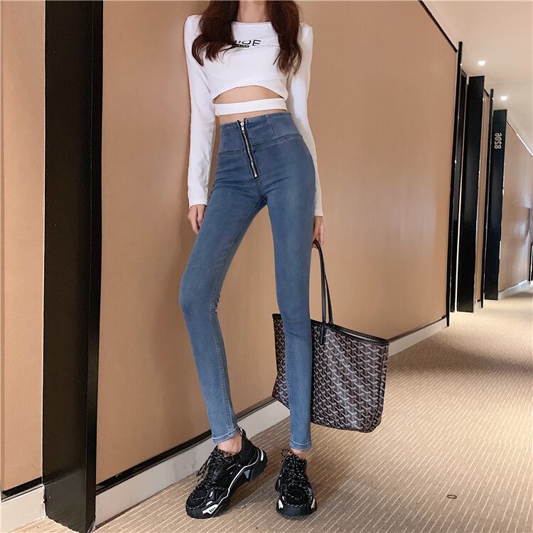 ジッパーハイウェストウェストジーンズ レディーススプリングオータムスリムパンツ 春物 秋物 Xiaofeijia82696713537