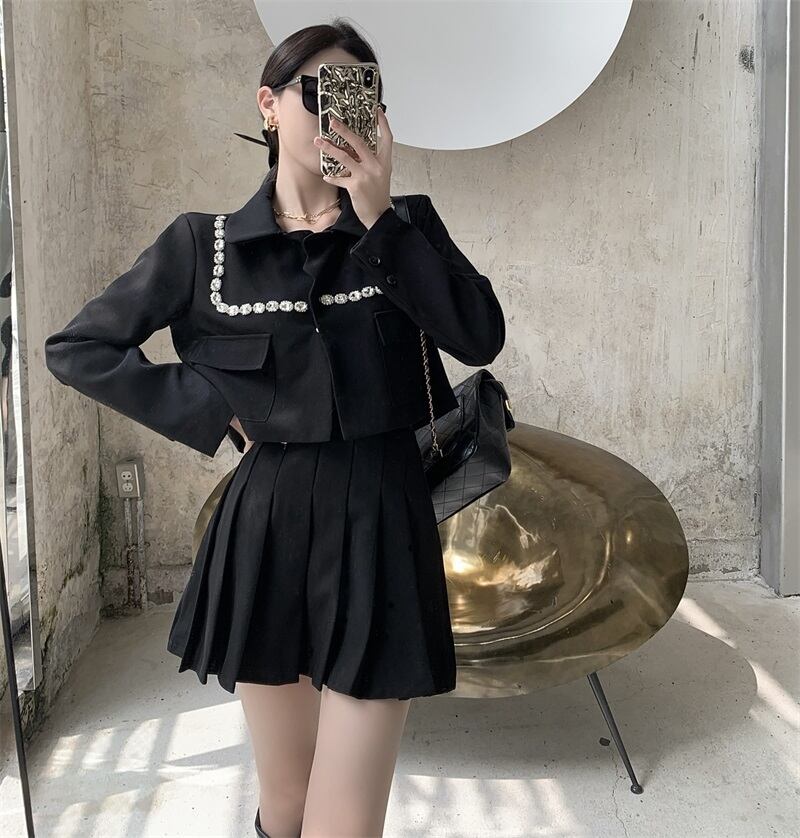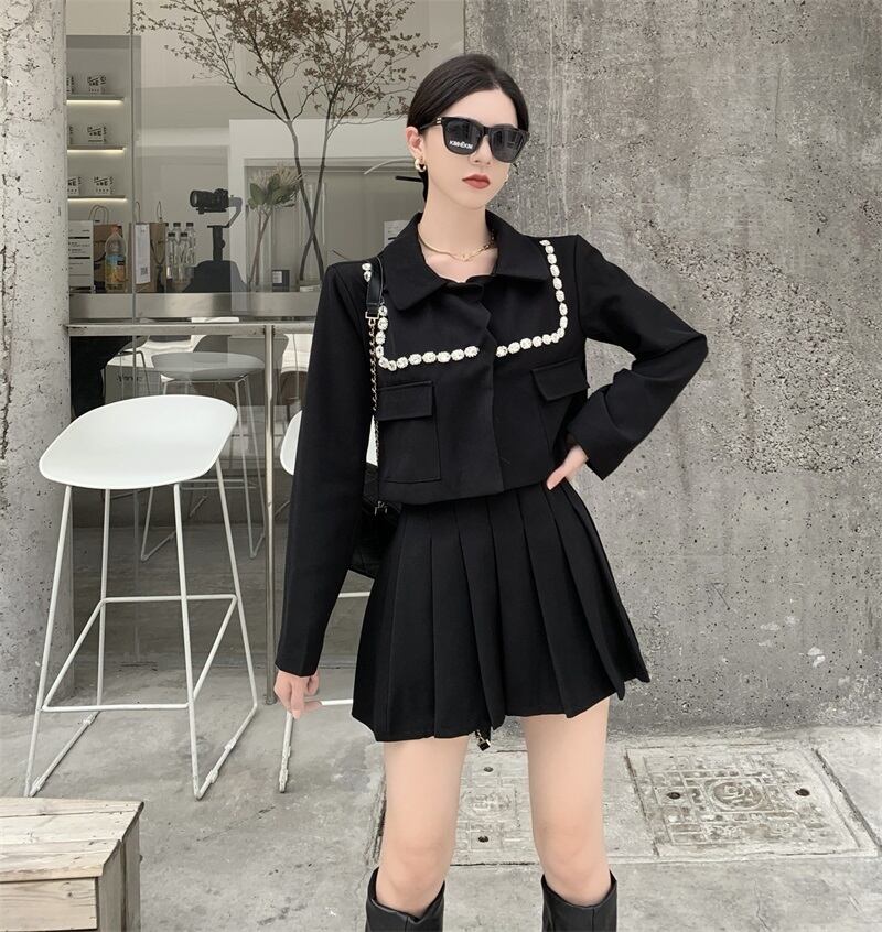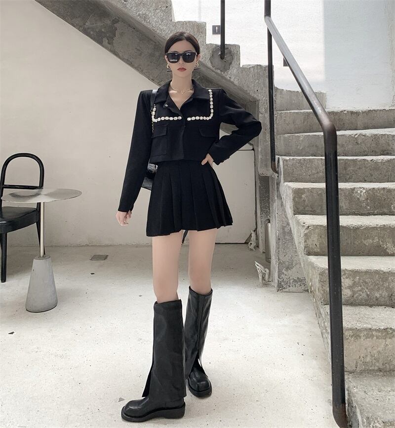 ダークジャケット ハイウェストウェストプリーツスカート Xiaofeijia90382713652