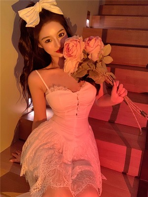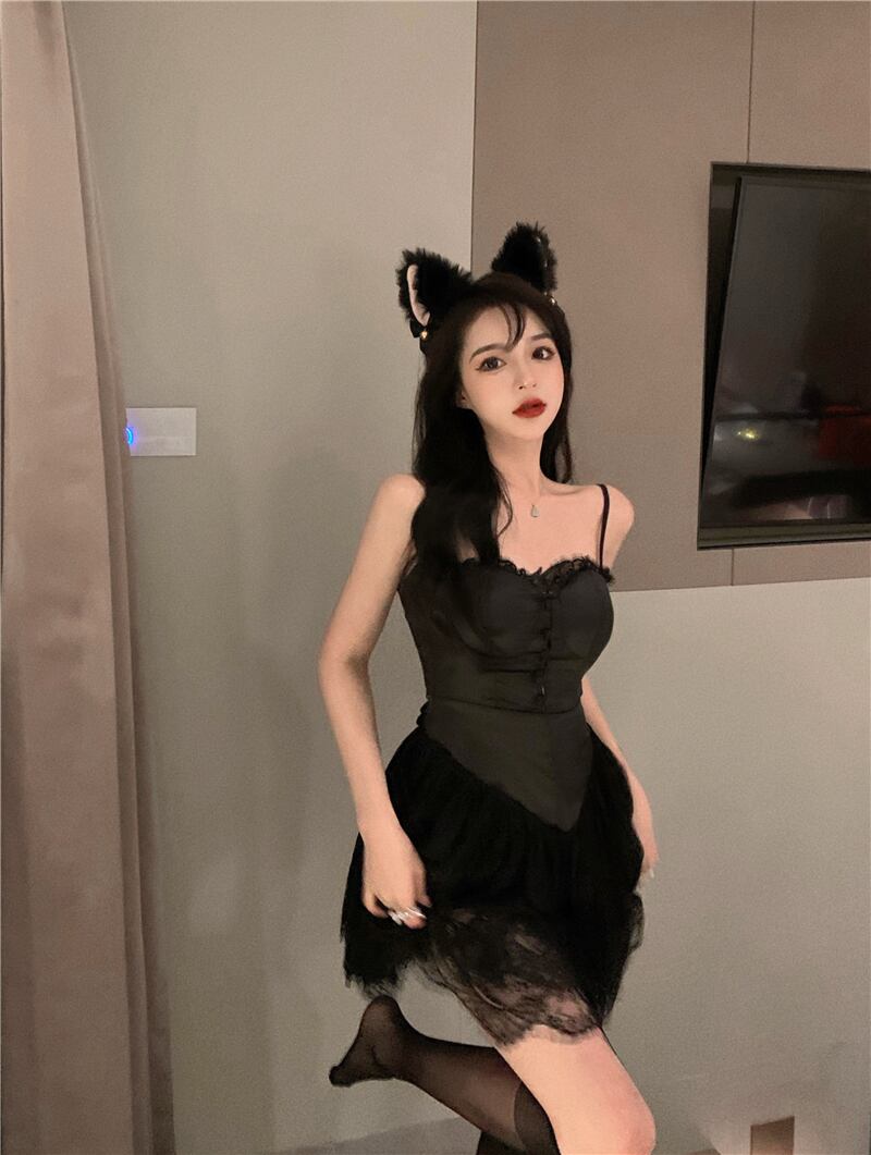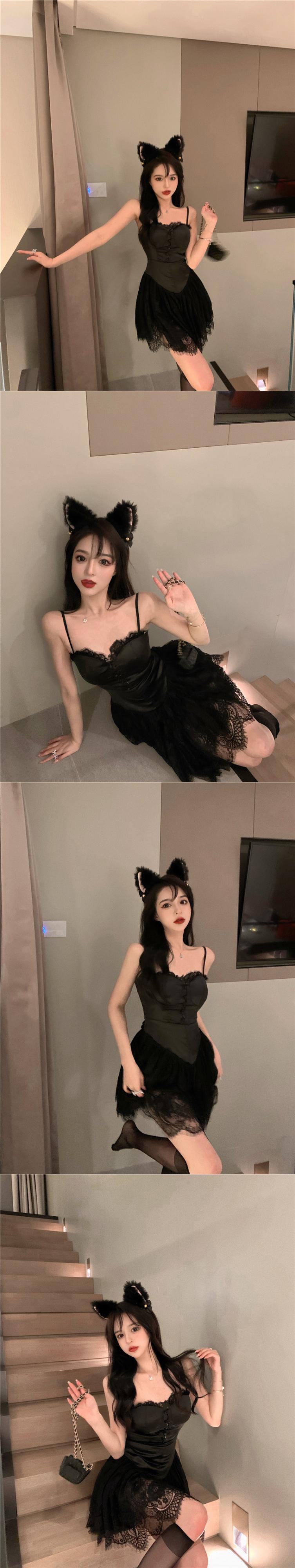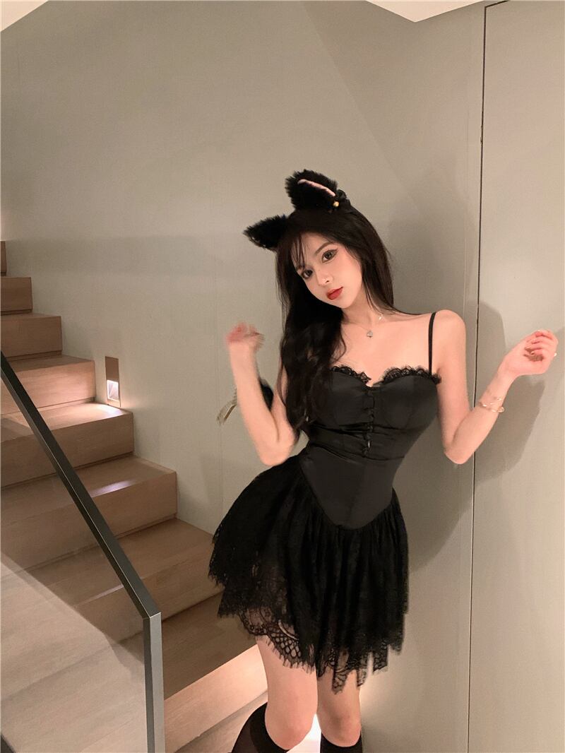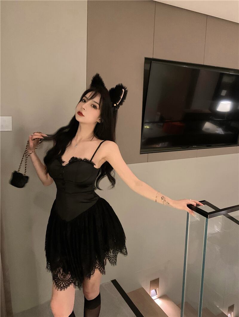 スタイルショートスカート レースブラックドレス サマースリム 夏物 ステッチ Xiaofeijia37492239489